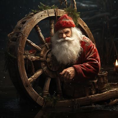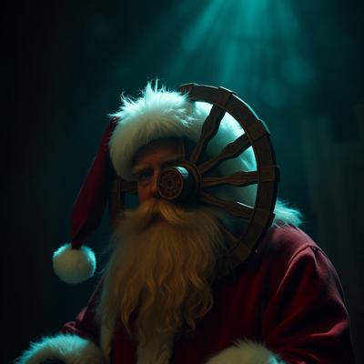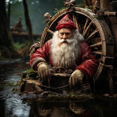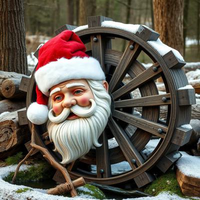 Голова деда мороза приделана на деревянное колесо болото