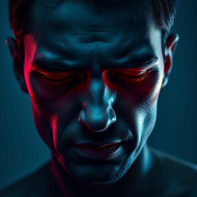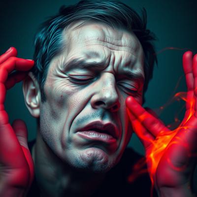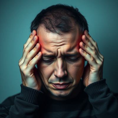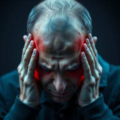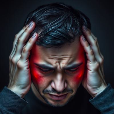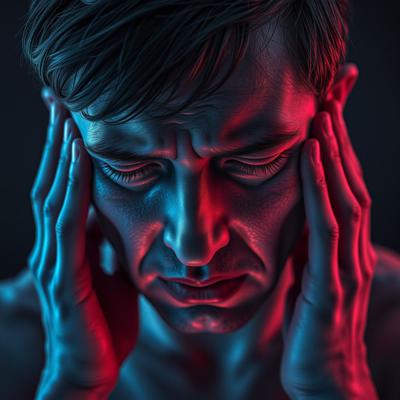 Фокус на голове, крупный план лица, или более общий план, показывающий человека в состоянии дискомфорта., Цветовая гамма: Темные, холодные тона (синий, серый, фиолетовый) часто ассоциируются с болью и беспокойством. Яркие, тревожные цвета (красный, оранжевый) могут подчеркнуть внезапность приступа.,