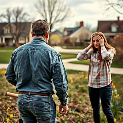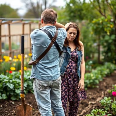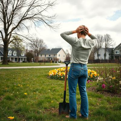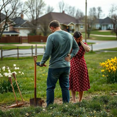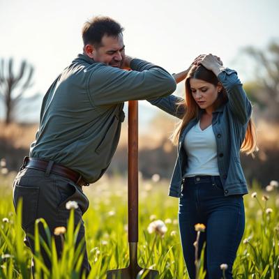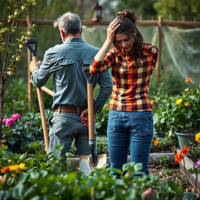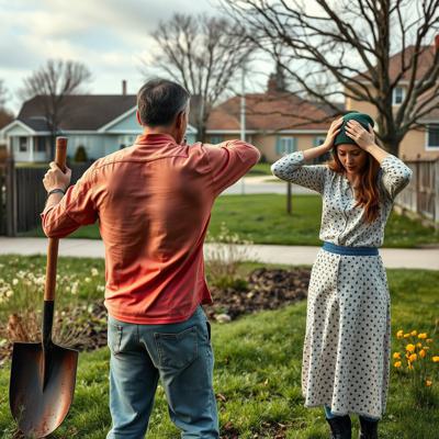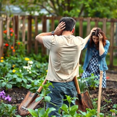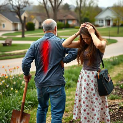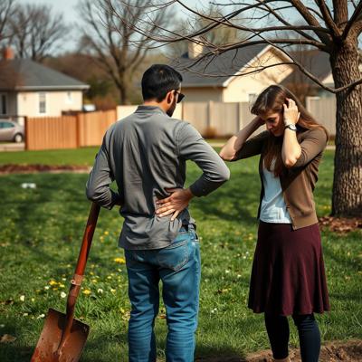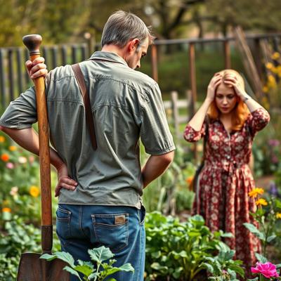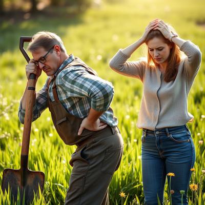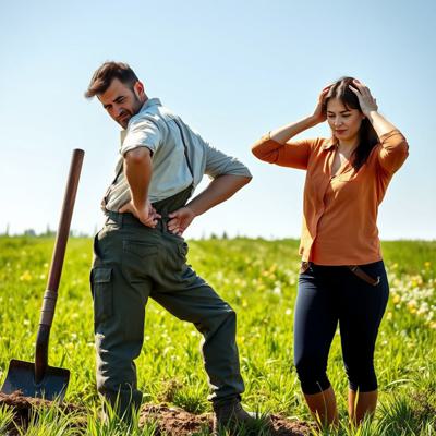 Весенний пейзаж, дачный участок. Мужчина с лопатой, его спина явно болит. Женщина рядом, обеспокоенная, держит руки у головы. Возможен стиль: фотореализм