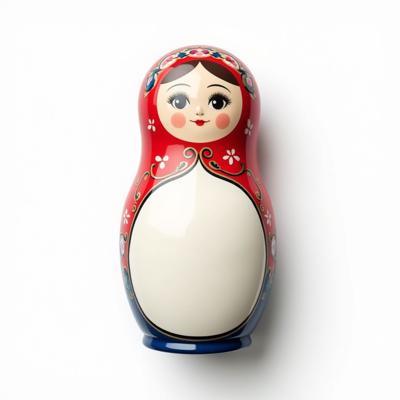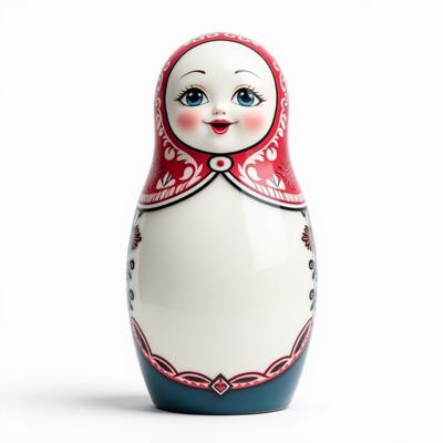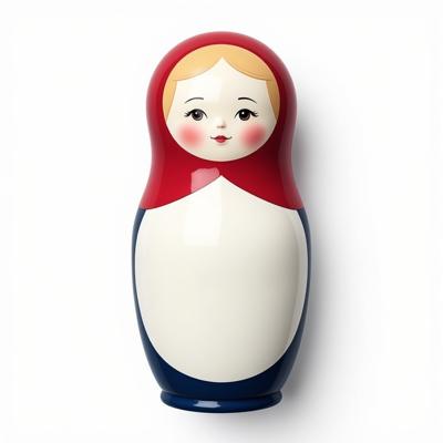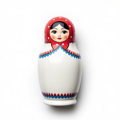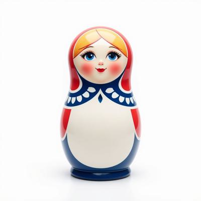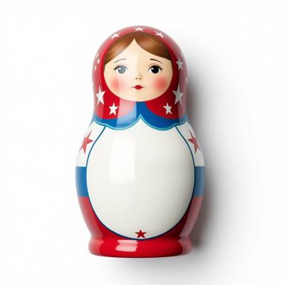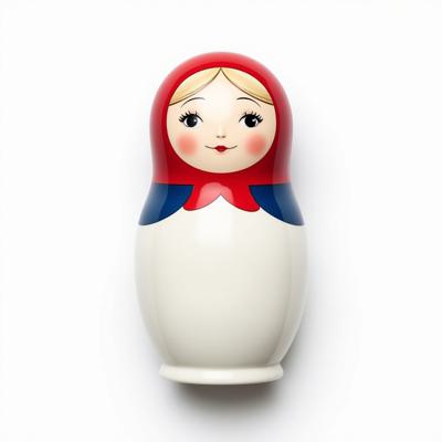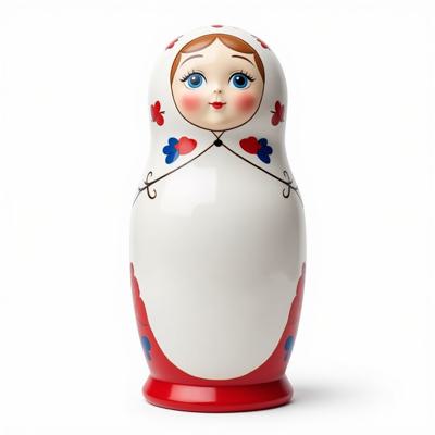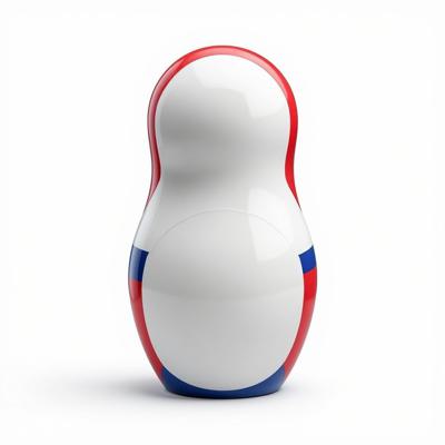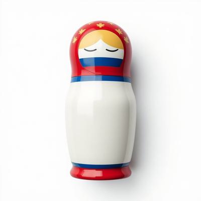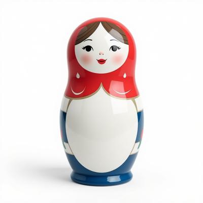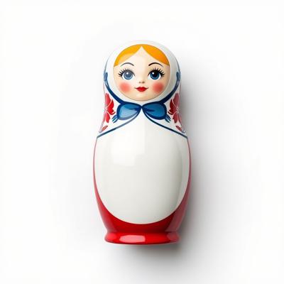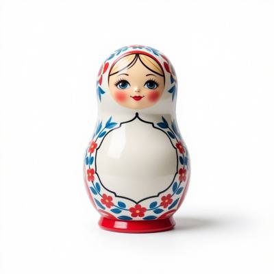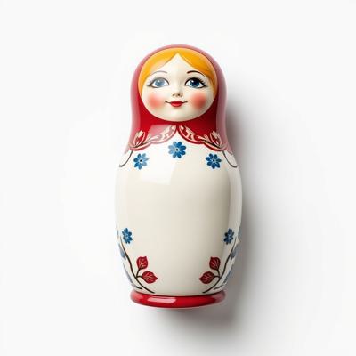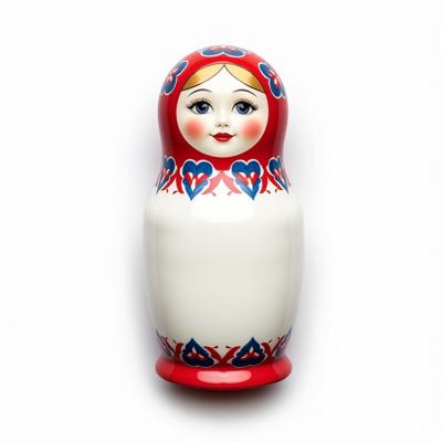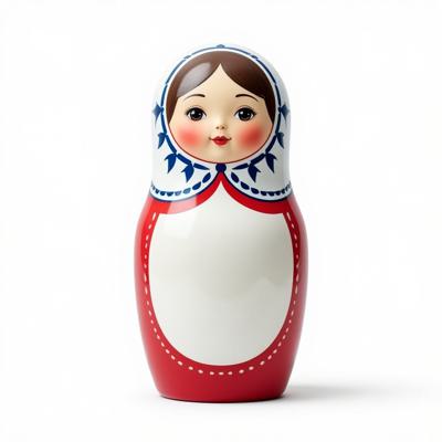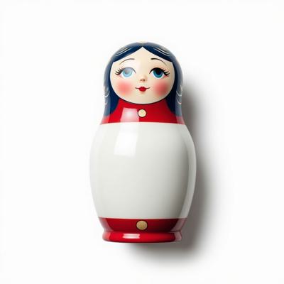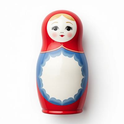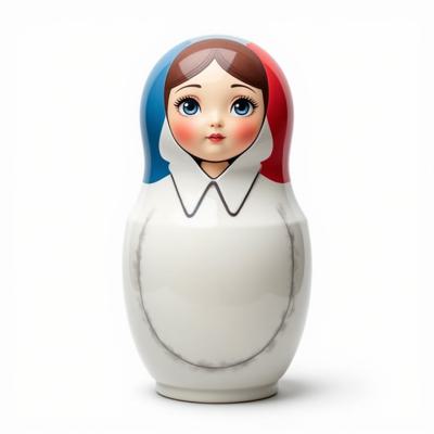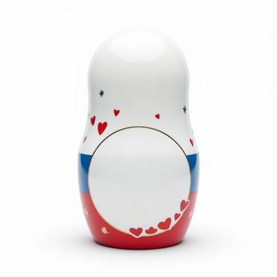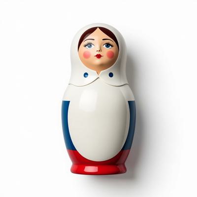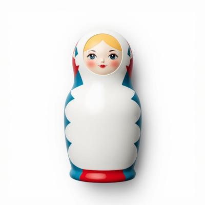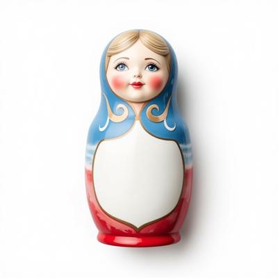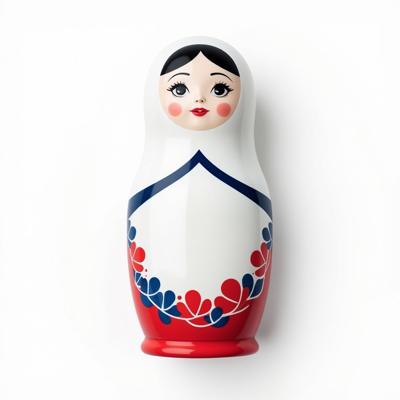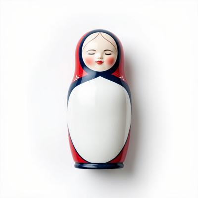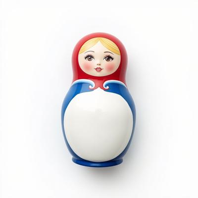 Матрешка с бело-красно-синим русским узором. На животе пустое место под логотип. Она лежит на белом фоне. Вид сверху