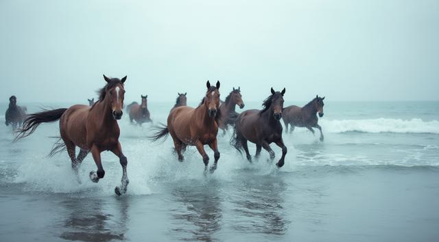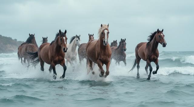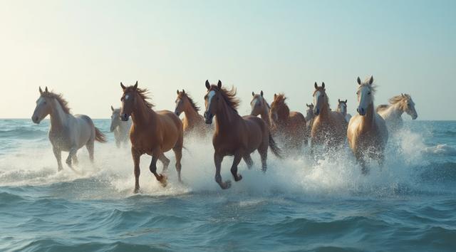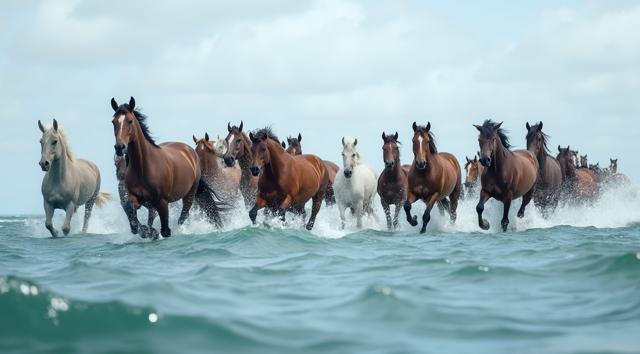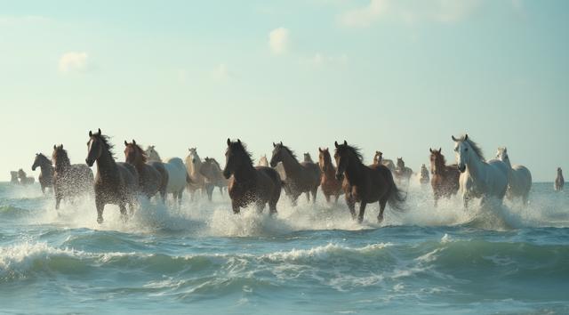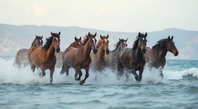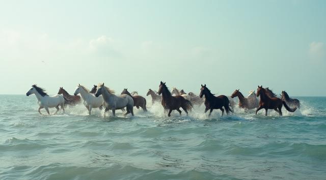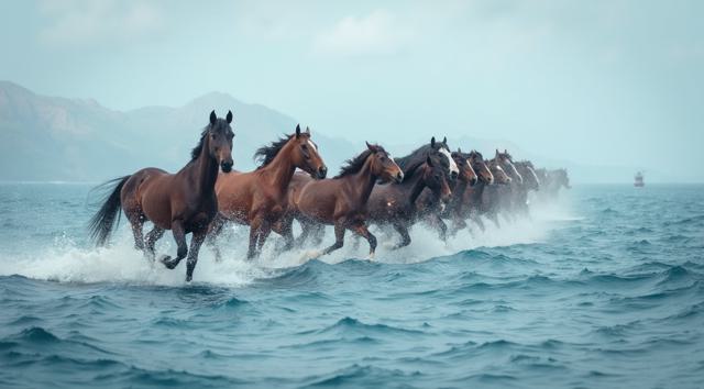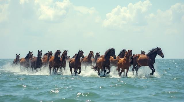 Табун гнедых лошадей плывет по океану