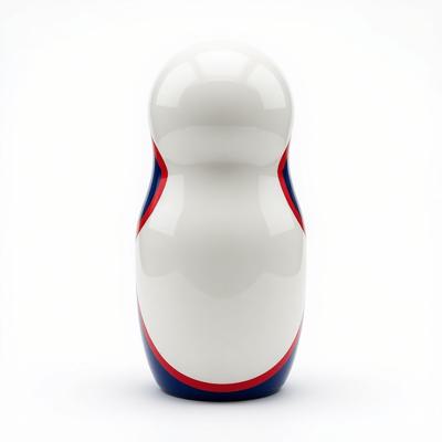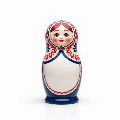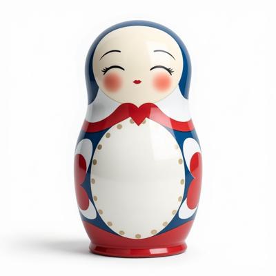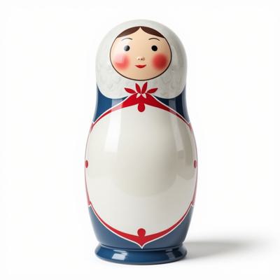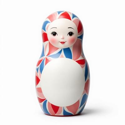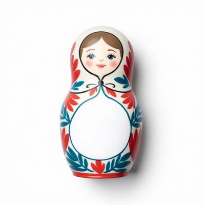 Матрешка с бело-красно-синим русским узором гжель. На животе пустое место под логотип. Она лежит на белом фоне. Вид сверху