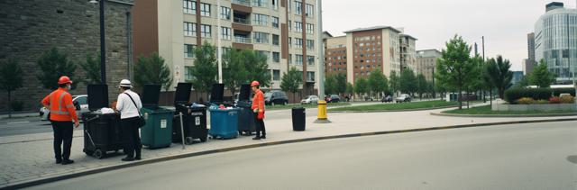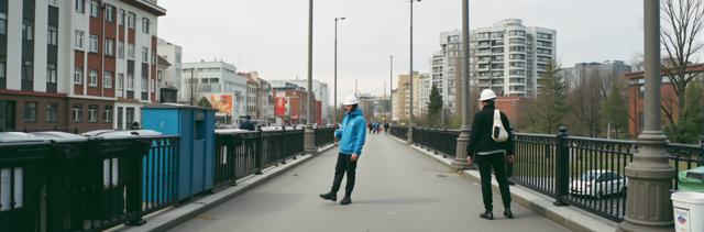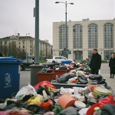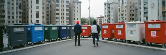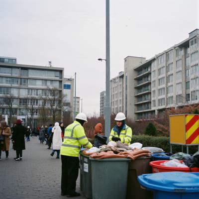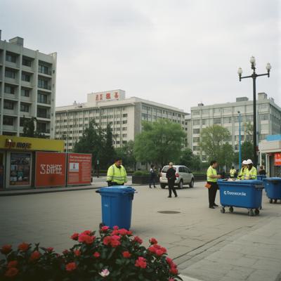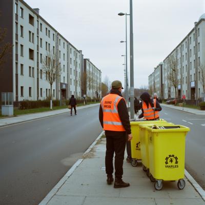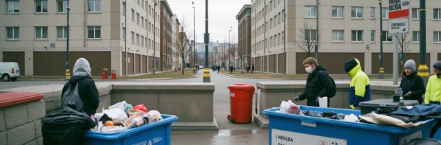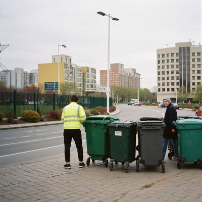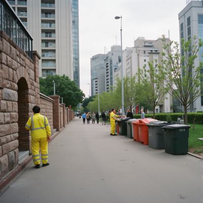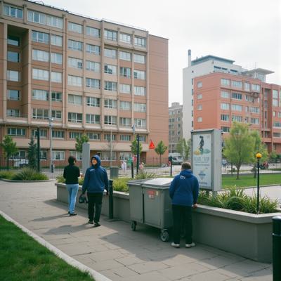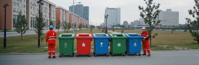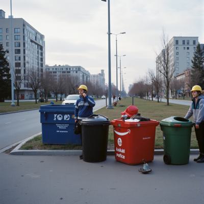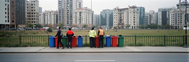 Создай фотореалистичное изображение по теме сортировки мусора в г. Тюмени. На фотографии должны стоить баки для сортировки мусора возле которых стоят рабочие-уборщики в специальной форме. Все это на фоне нового современного микрорайона