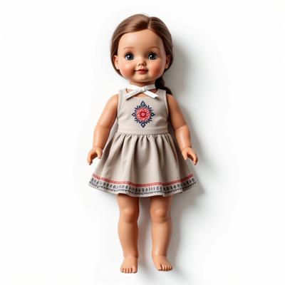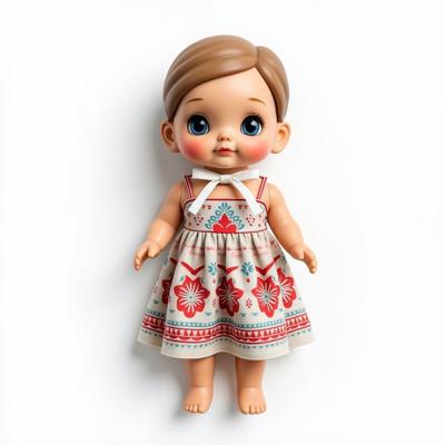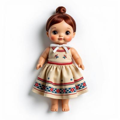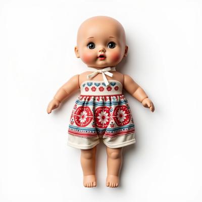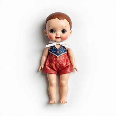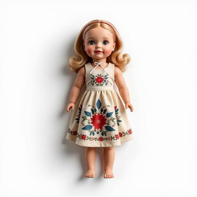 кукла в русском стиле в сарафане и кокошнике украшенном красно-синим русским узором, с белой лентой на шее. Кукла лежит на белом фоне. Вид сверху