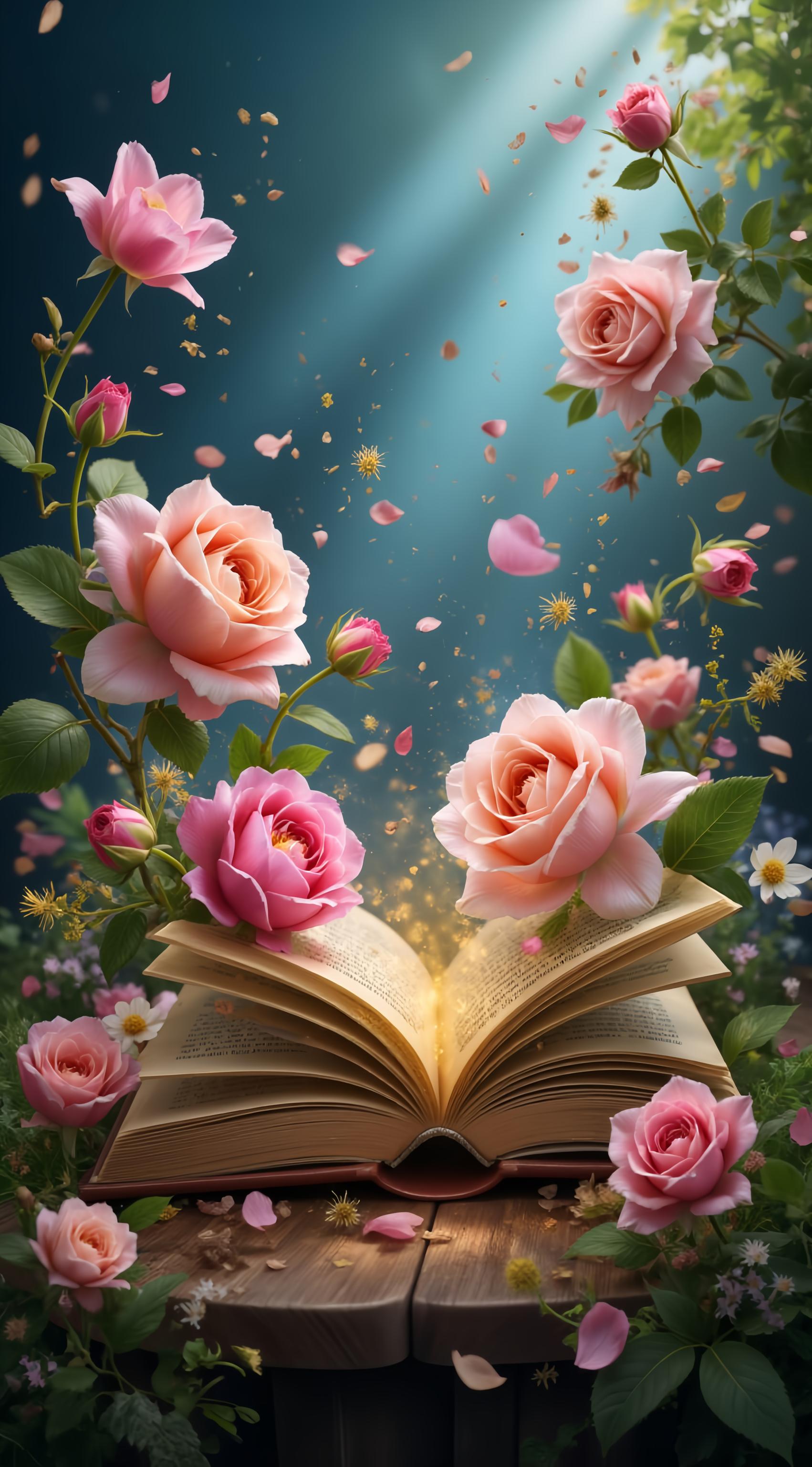 Открытая книга с синей обложкой в книге красивые цветы - розы, тюльпаны, орхидеи, зелень, волшебные истории про прекрасных девушек. Фотография высокой детализации [Качество x3 ]