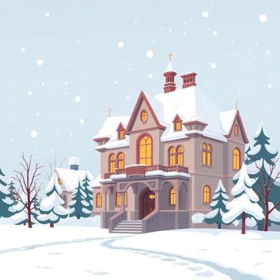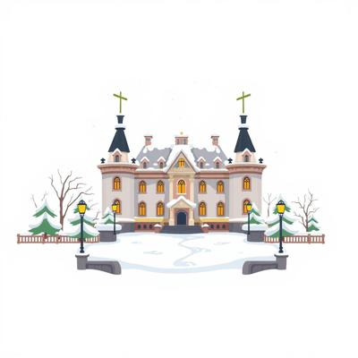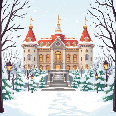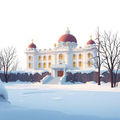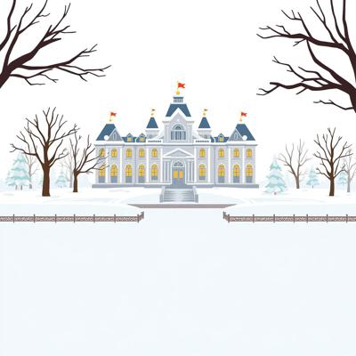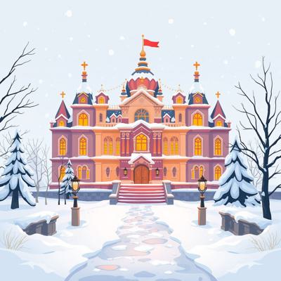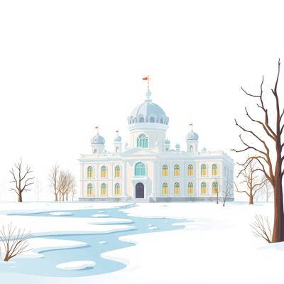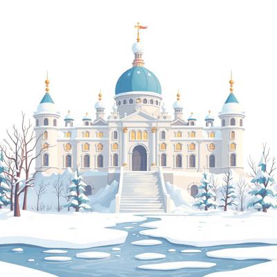 на белом фоне мультяшный , зимний дворец в снегу, снег тает,