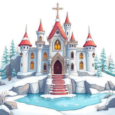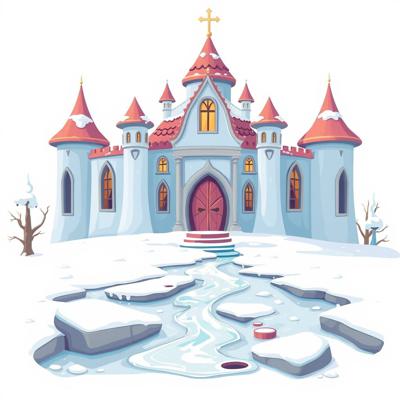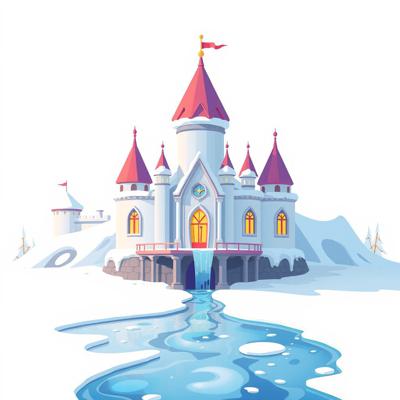 на белом фоне мультяшный дворец снежной королевы, растаял вода течет ,