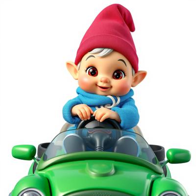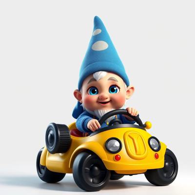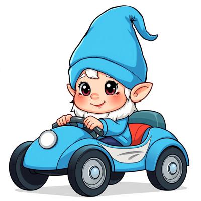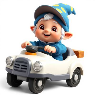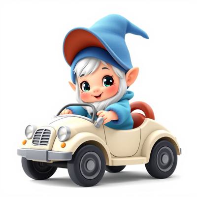 гномик малыш в синей одежде и синем колпачке с большими красивыми глазами едет на детской машинке мультяшные на белом фоне
