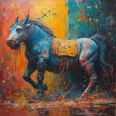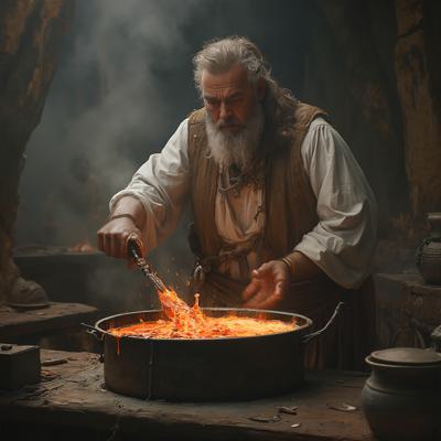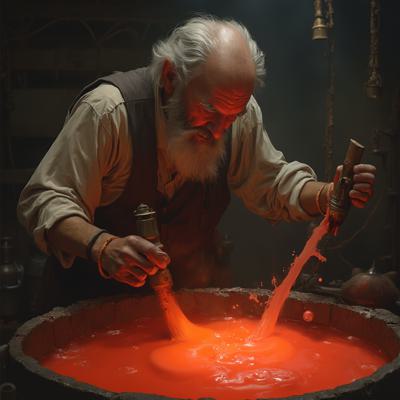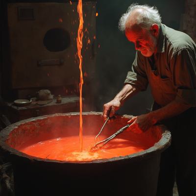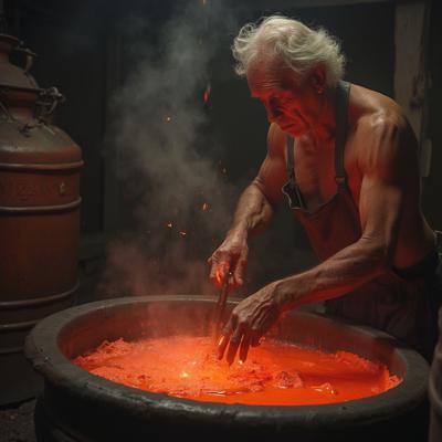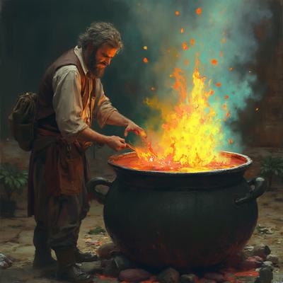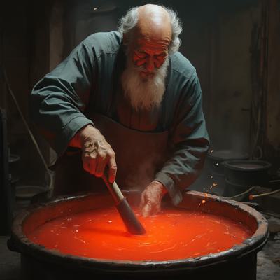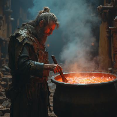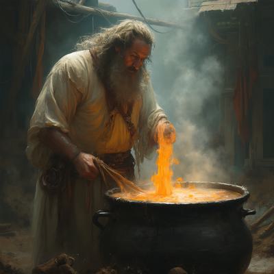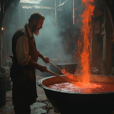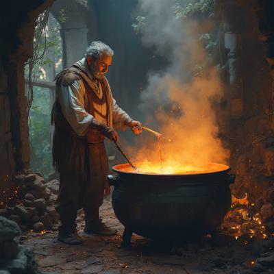 Мужчина стоит у большого котла и мешает так густую разноцветную жидкость