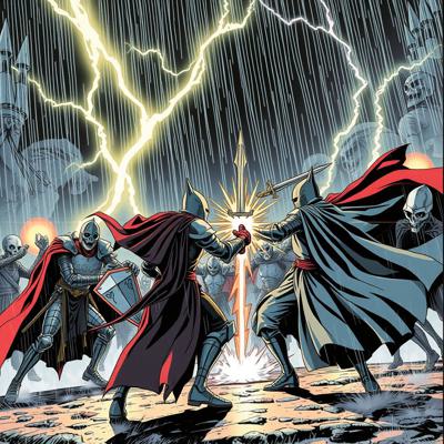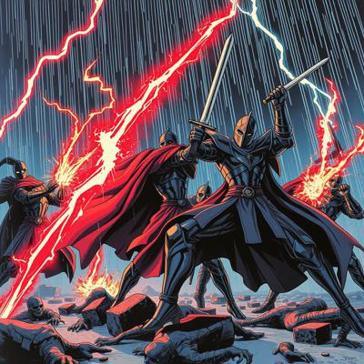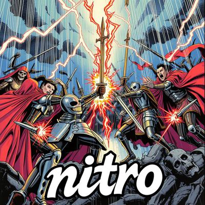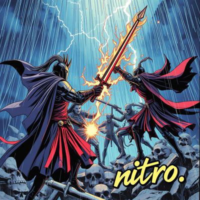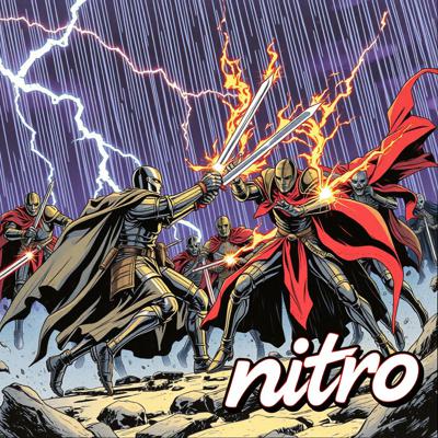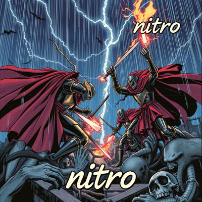 retro anime gothic battle scene, knights fighting undead, slow-motion sparks flying, flowing capes, exaggerated poses, rain and lightning, intense hand-drawn energy lines, cinematic lighting, dramatic 80s anime style, slightly desaturated palette, VHS scanlines, text or sign 'NITRO'