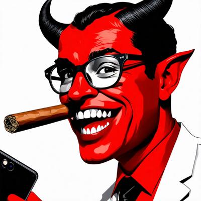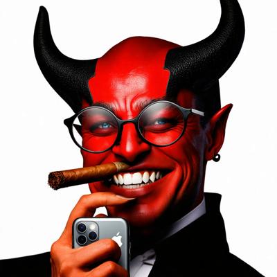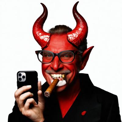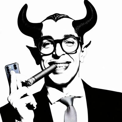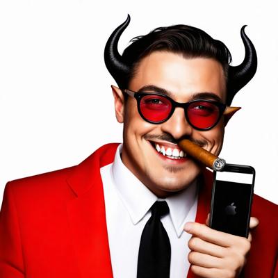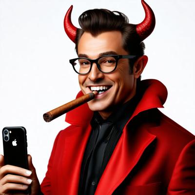 сгенерируй портрет дьявола в очках, который держит в одной руке iPhone 17 Pro Max, во рту у него толстая сигара, улыбка с острыми зубами. Белый фон.