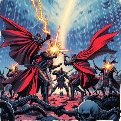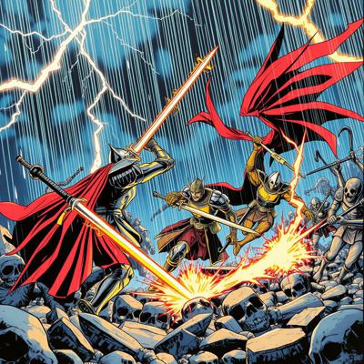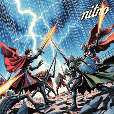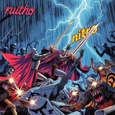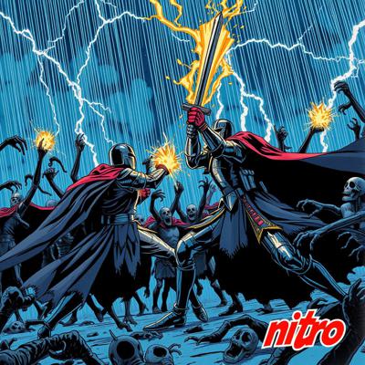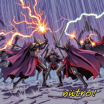 retro anime gothic battle scene, knights fighting undead, slow-motion sparks flying, flowing capes, exaggerated poses, rain and lightning, intense hand-drawn energy lines, cinematic lighting, dramatic 80s anime style, slightly desaturated palette, VHS scanlines, text or sign 'NITRO' (Make the inscription bigger so that it looks like lightning behind the warriors)