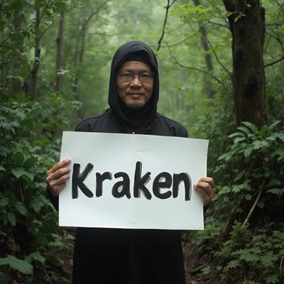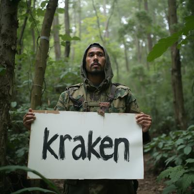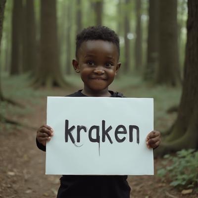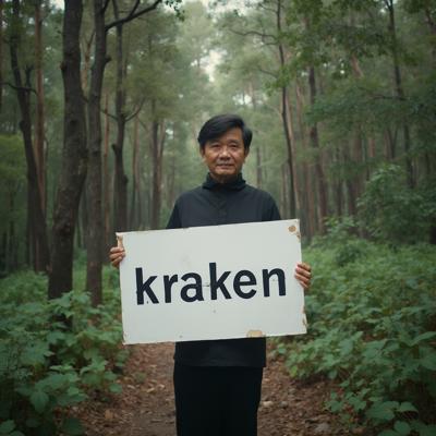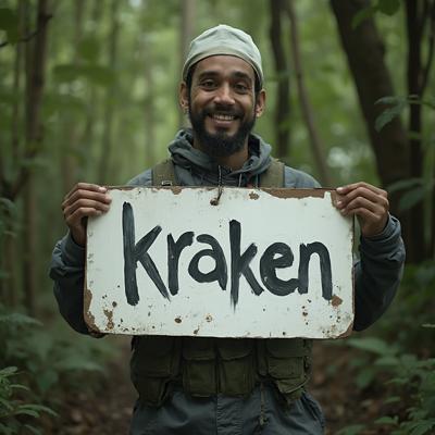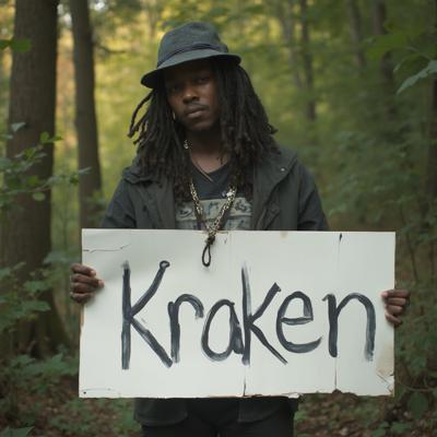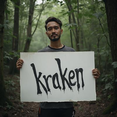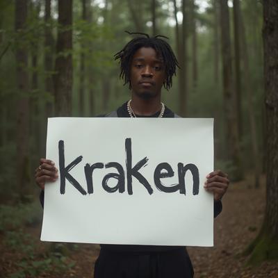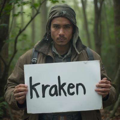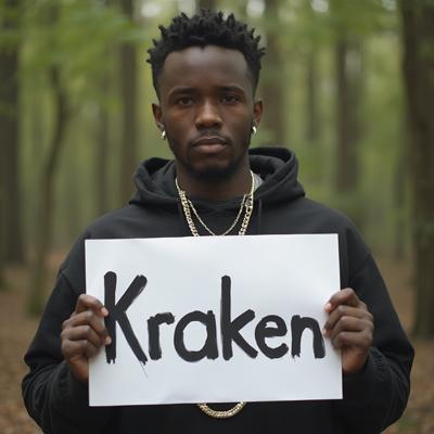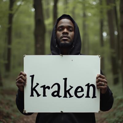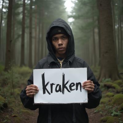 Сделай фото как рэпер Baby Melo держит белую табличку с черной надписью KRAKEN в лесу