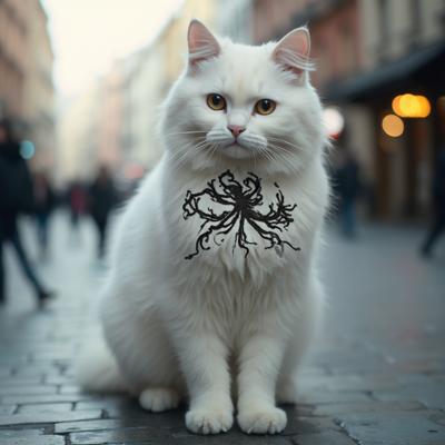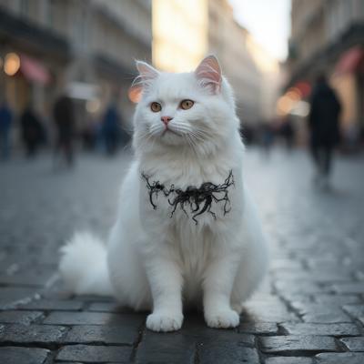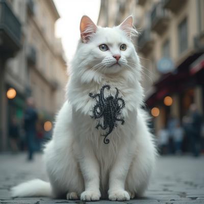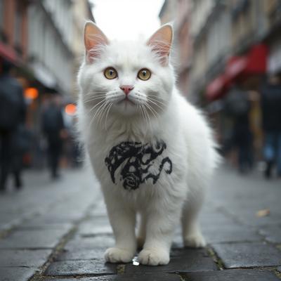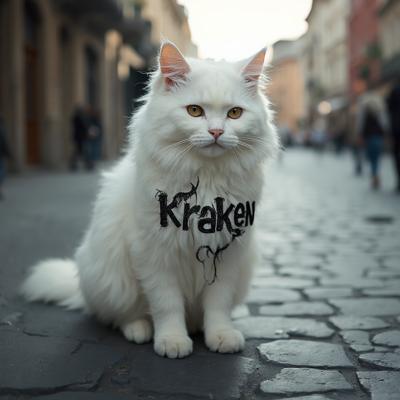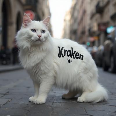 Белый кот с черной надписью KRAKEN на его шерсти стоит в городе днем