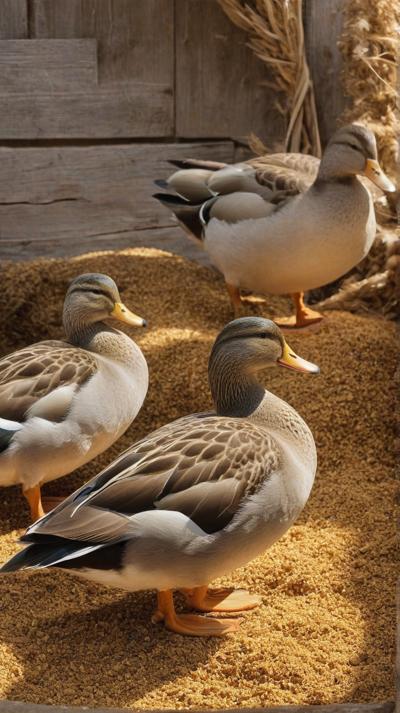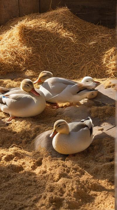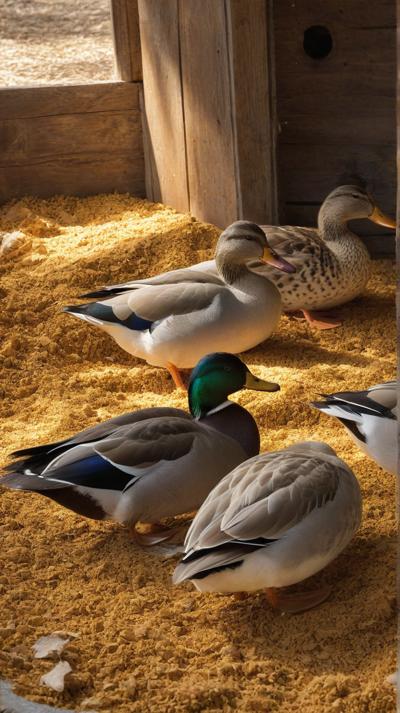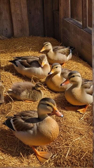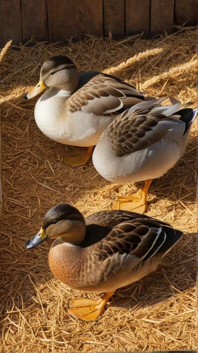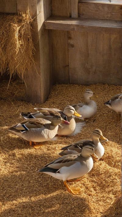 В спокойной обстановке сарая очаровательная группа уток уютно устроилась на мягкой подстилке из золотистых древесных опилок. Теплые, землистые тона опилок прекрасно контрастируют с яркими перьями уток, каждая из которых мягко эхом разносится в тихом пространстве. Солнечный свет мягко проникает сквозь деревянные планки сарая, отбрасывая пятнистые тени, которые танцуют по всей сцене. Атмосфера преисполнена сельской тишины, запечатлевая простую, естественную красоту сельской жизни с живыми деталями., ,