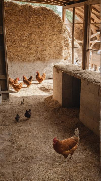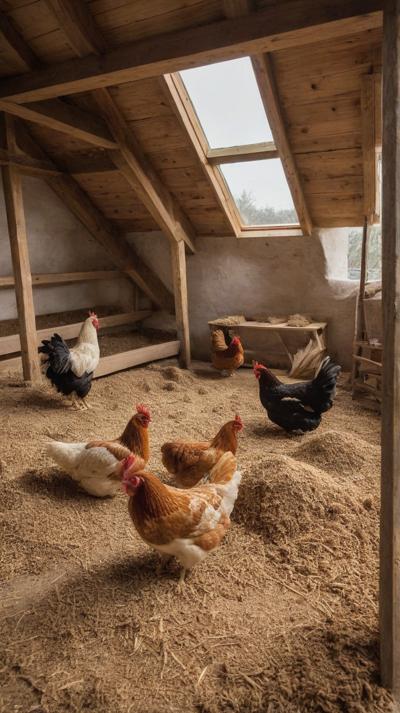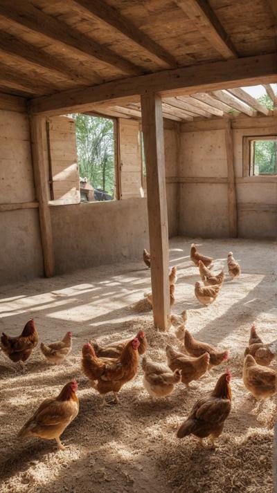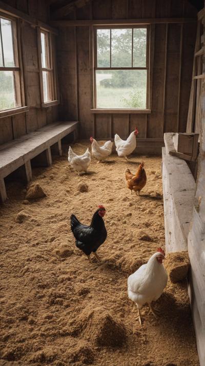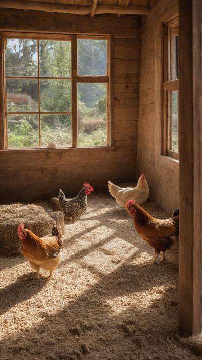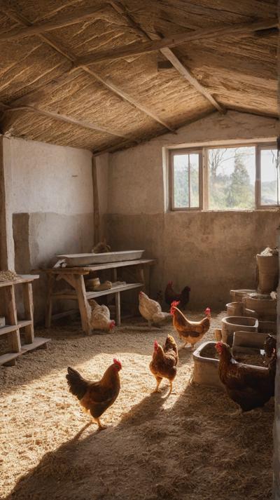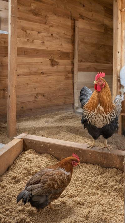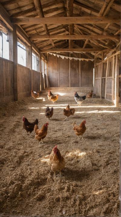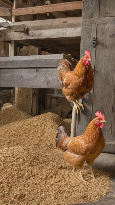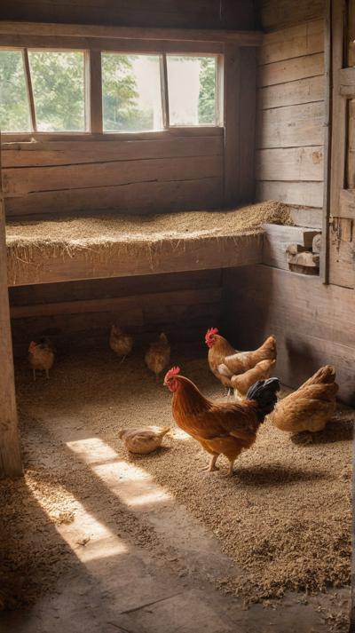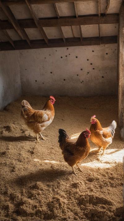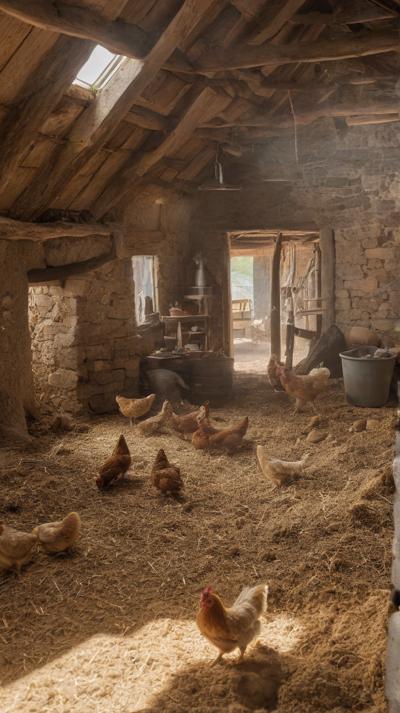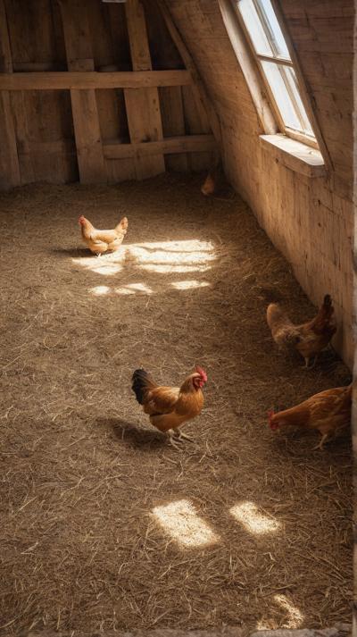 В деревенском курятнике курочки бродят по полу, усланному крупными опилками. Грубая текстура опилок придает пространству естественную, природную атмосферу. Курицы двигаются не спеша, добавляя ощущение жизни и простоты в пасторальное окружение. Естественный свет пробивается через небольшие отверстия в курятнике, отбрасывая мягкие тени, которые танцуют по полу, подчеркивая контраст между гладкими перьями кур и грубой поверхностью внизу.