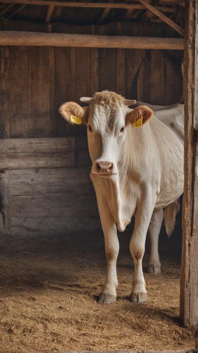 В деревенской стайке корова стоит по полу, усланному крупными опилками. Грубая текстура опилок придает пространству естественную, природную атмосферу. двигаются не спеша, добавляя ощущение жизни и простоты в пасторальное окружение. Естественный свет пробивается через небольшие отверстия в коровнике, отбрасывая мягкие тени.