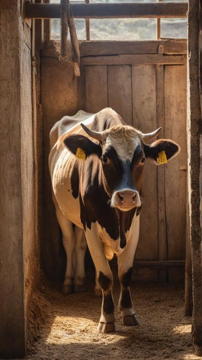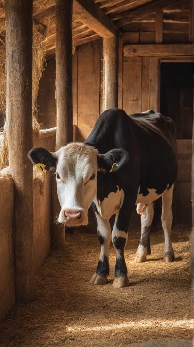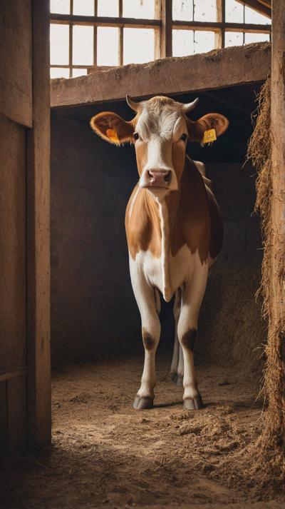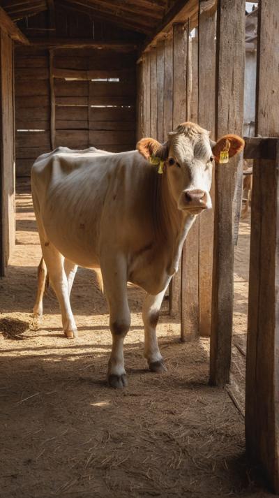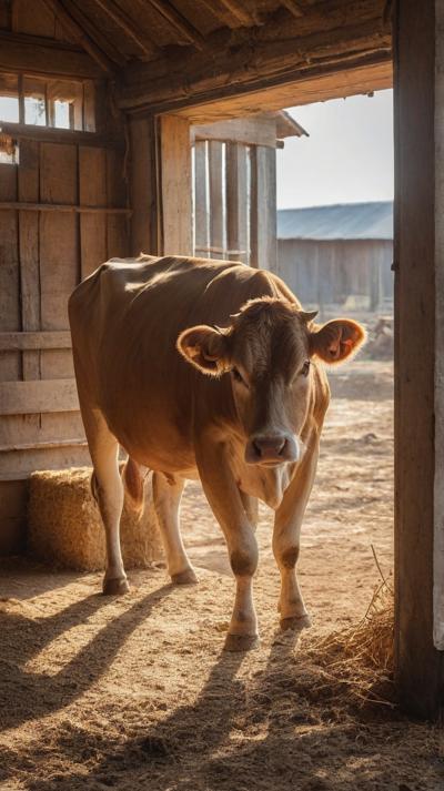 Умиротворённая корова спокойно стоит внутри деревенского коровника, её копыта мягко утопают в толстом слое грубых опилок, щедро рассыпанных по полу. Солнечный свет просачивается сквозь щели деревянных стен, отбрасывая тёплые золотистые полосы на текстурированную поверхность интерьера коровника. Атмосфера тихая и сельская, подчёркивающая простую деревенскую жизнь.