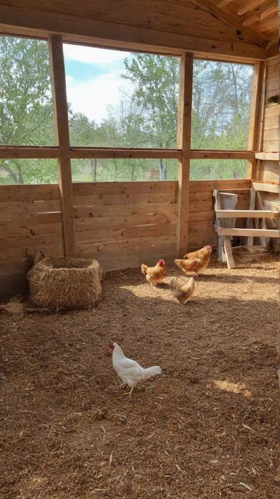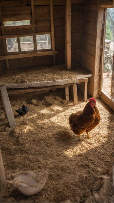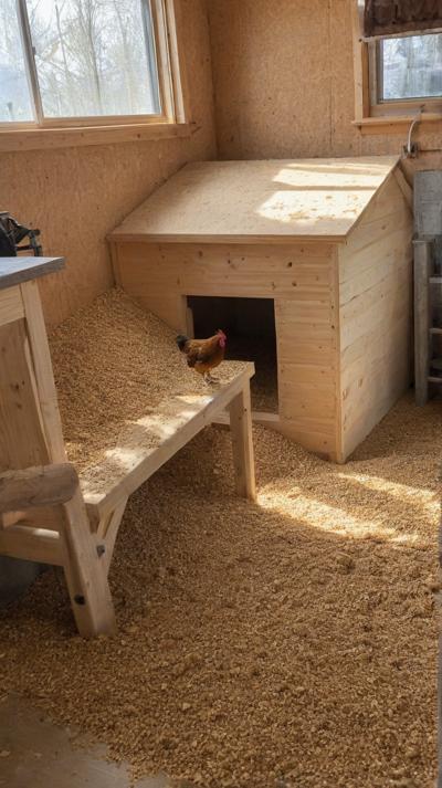 курятник на полу крупные опилки рядом курочка сидит на насесте