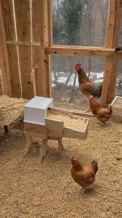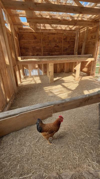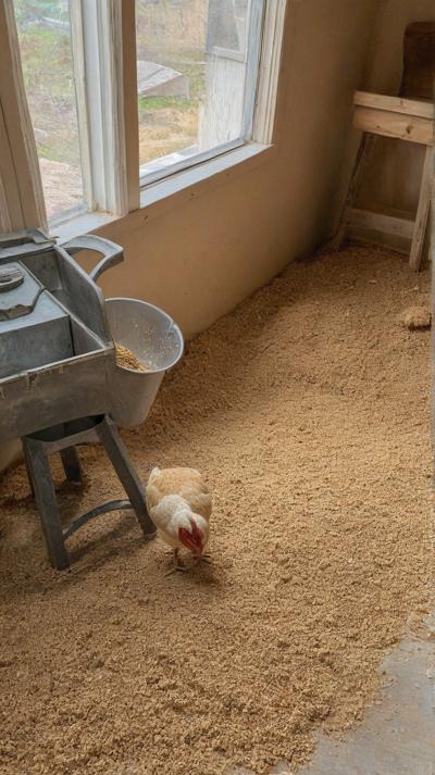 курятник на полу опилки крупные стружка рядом курочка сидит на насесте