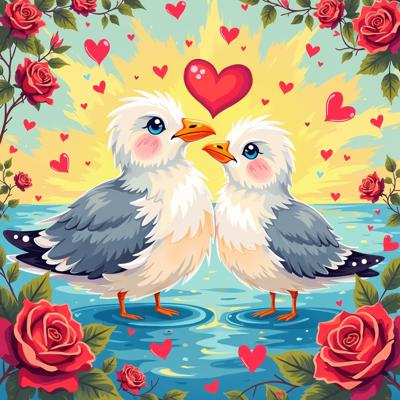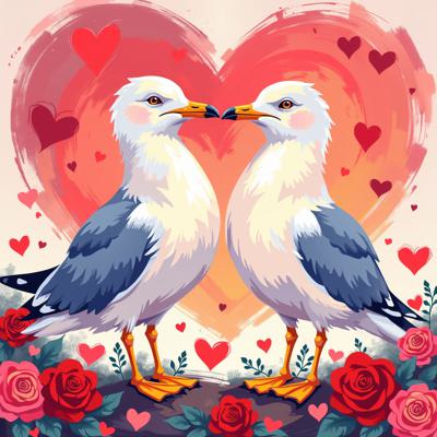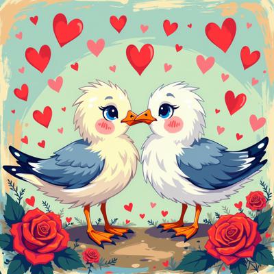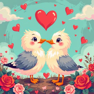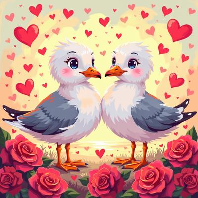 миленькие мультяшные чайки влюбленные .красивые глазки.счастливые., много красных сердечек и розочки.