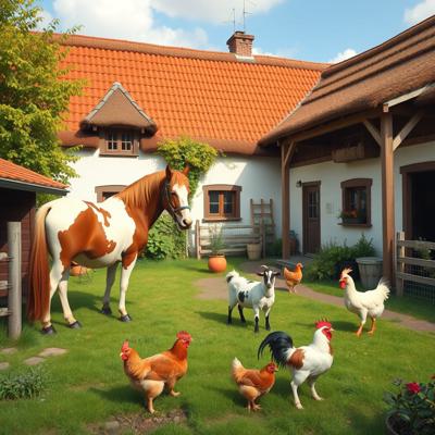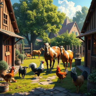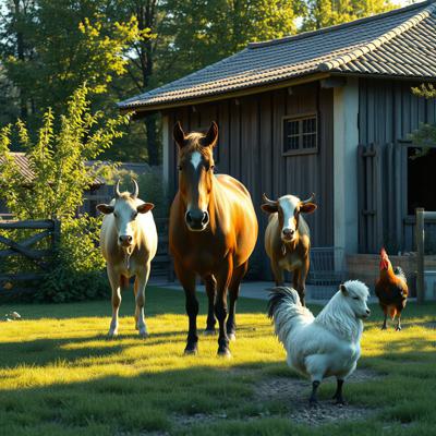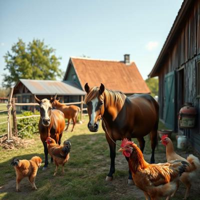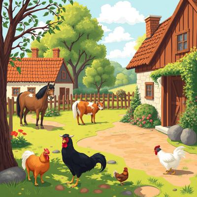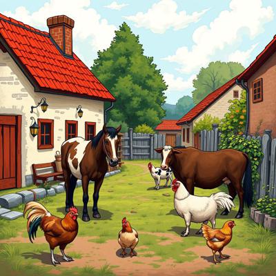 Деревенский двор на котором разные домашние животные (конь, корова, коза, курица) - личное подсобное хозяйство, в ярких красках