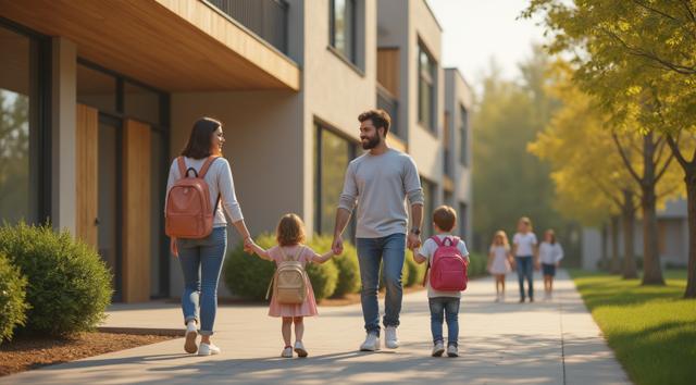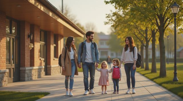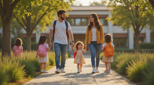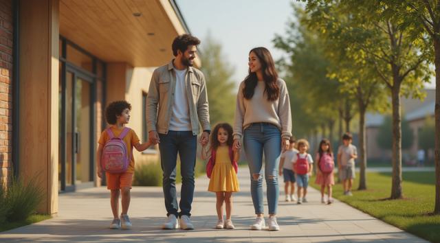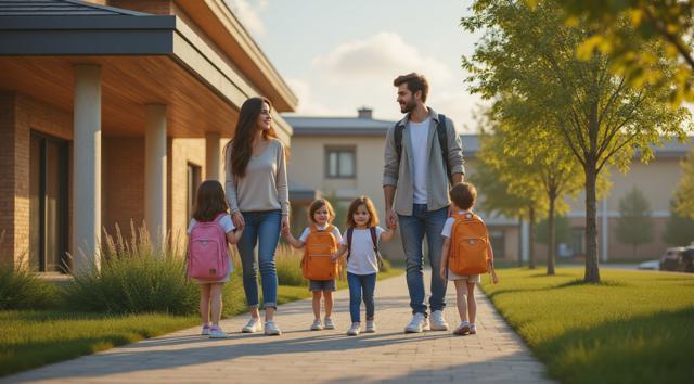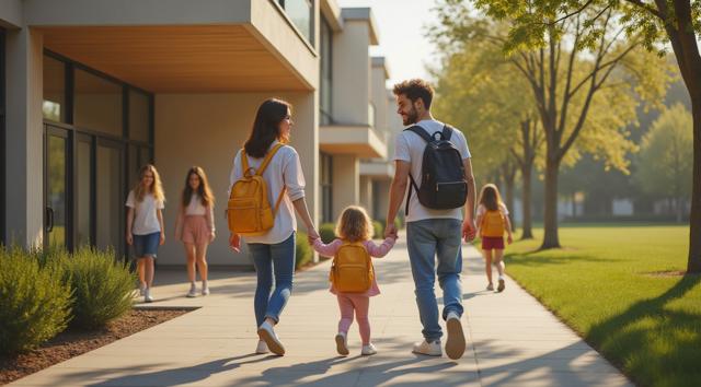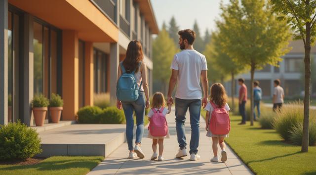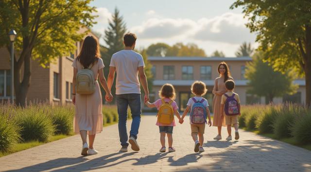 Фотореалистичная сцена у современного детского сада в Татарстане: молодая мама или папа держит за руку маленького ребёнка у входа в здание, рядом стоят ещё несколько детей с яркими рюкзачками, улыбаются воспитатели. На фоне — аккуратное светлое здание детского сада, зелёные деревья, ухоженная территория, мягкий дневной свет, ясная погода. Атмосфера должна передавать заботу, доверие, спокойствие и радость начала нового этапа. Композиция — как для новостного поста в соцсетях, естественные позы, реалистичные лица, современная одежда, без мультяшности.