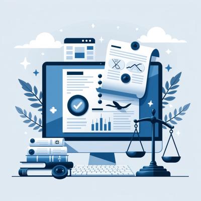 Создайте профессиональную иллюстрацию для статьи о противодействии коррупции. На изображении должны быть изображены: весы правосудия, официальные документы с печатями, цифровая система контроля (монитор с графиками и диаграммами). Используйте официальную цветовую гамму (синие, белые, серые тона) с акцентами красного цвета. Стиль должен быть реалистичным, деловым и подходящим для официальной публикации. Без текста на изображении. Высокое качество, четкие детали.