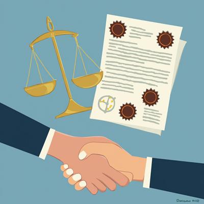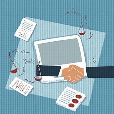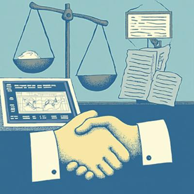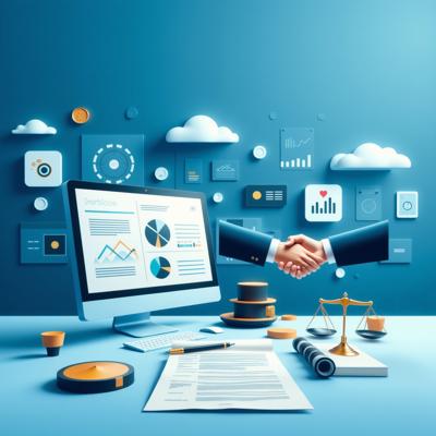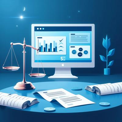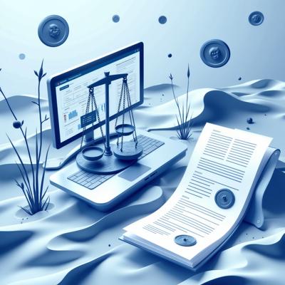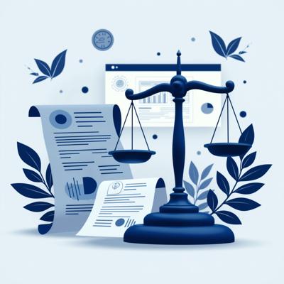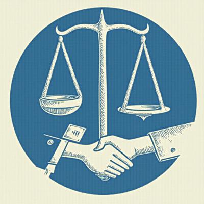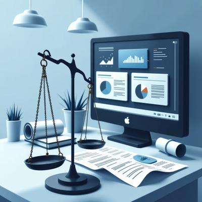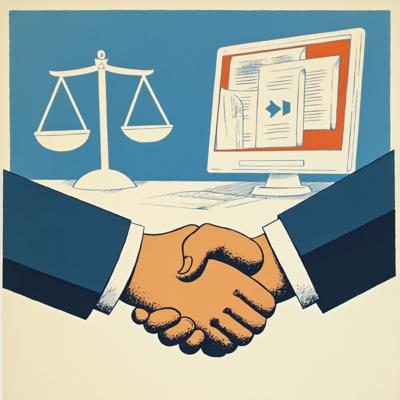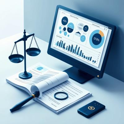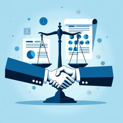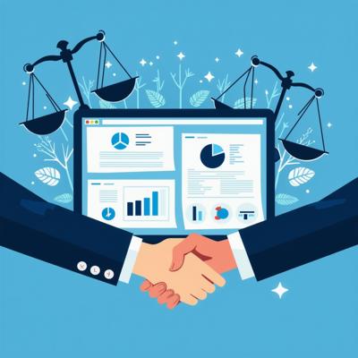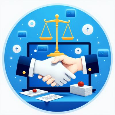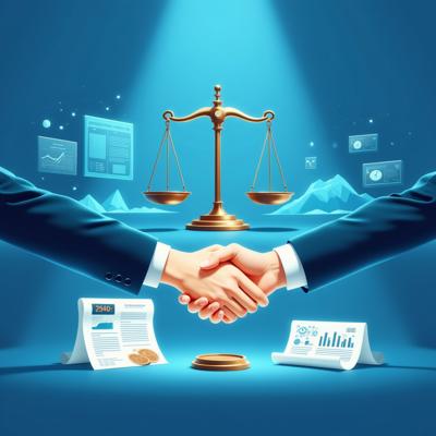 Создайте профессиональную иллюстрацию. На изображении должны быть изображены: весы правосудия, официальные документы с печатями, цифровая система контроля (монитор с графиками и диаграммами), рукопожатие в деловом стиле, символизирующее честную сделку. Используйте официальную цветовую гамму (синие, белые, серые тона) с акцентами красного цвета. Стиль должен быть реалистичным, деловым и подходящим для официальной публикации. Без текста на изображении. Высокое качество, четкие детали.