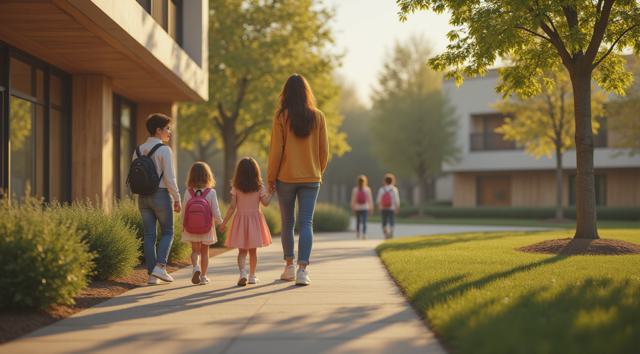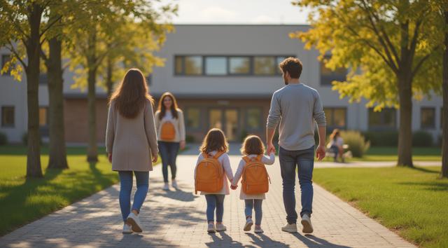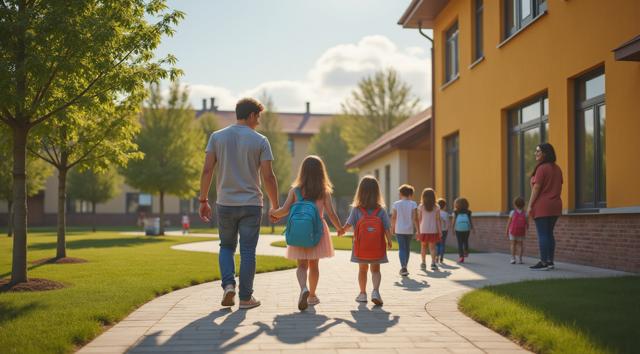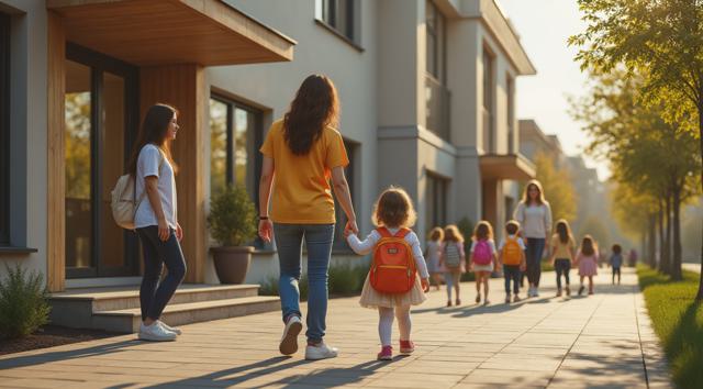 Фотореалистичная сцена у современного детского сада: молодая мама или папа держит за руку маленького ребёнка у входа в здание, рядом стоят ещё несколько детей с яркими рюкзачками, улыбаются воспитатели. На фоне — аккуратное светлое здание детского сада, зелёные деревья, ухоженная территория, мягкий дневной свет, ясная погода. Атмосфера должна передавать заботу, доверие, спокойствие и радость начала нового этапа. Композиция — как для новостного поста в соцсетях, естественные позы, реалистичные лица, современная одежда, без мультяшности.