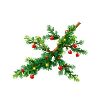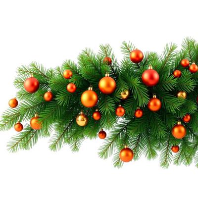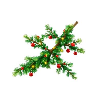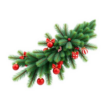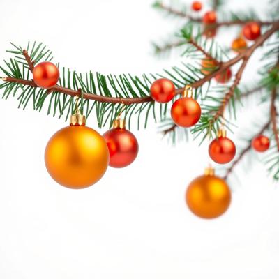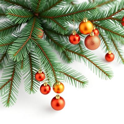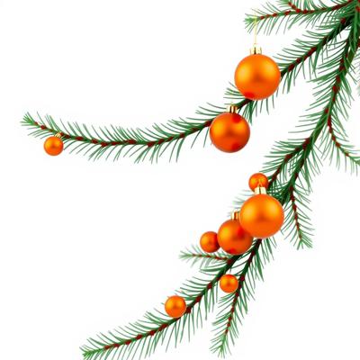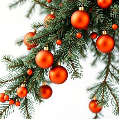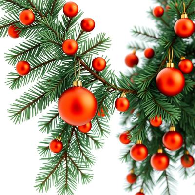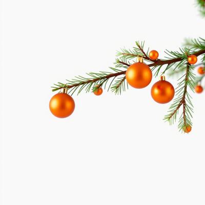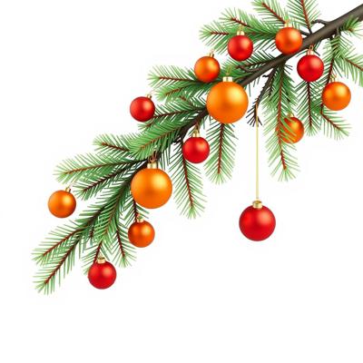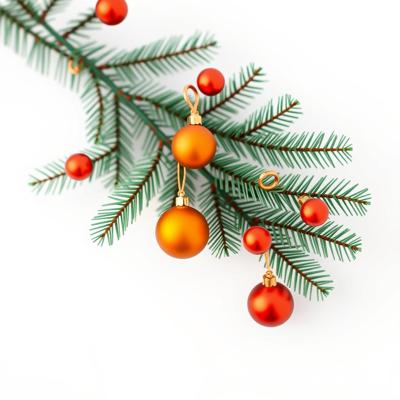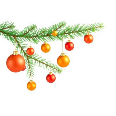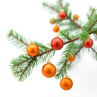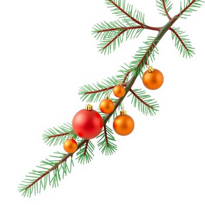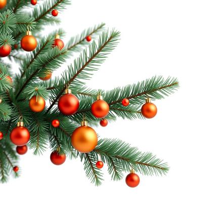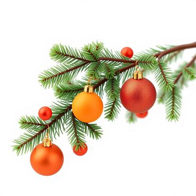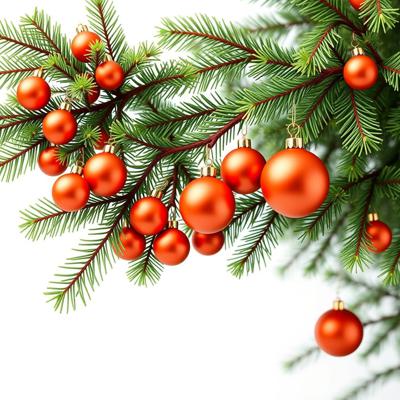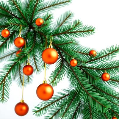 a large, lush branch of a Christmas tree with small orange and red Christmas balls, in plastic 3d style, on a white background