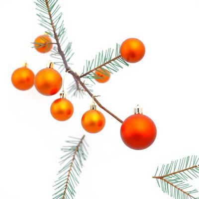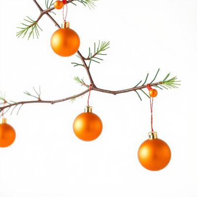 a branch of a Christmas tree with small orange and red Christmas balls, in plastic 3d style, on a white background