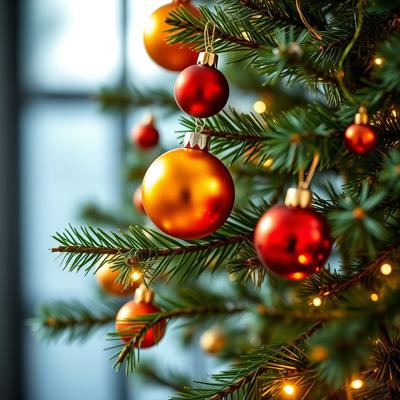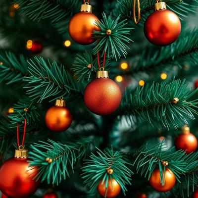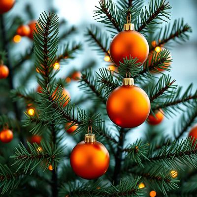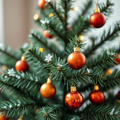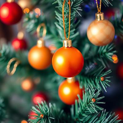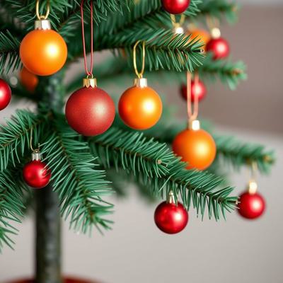 Christmas tree with small orange and red Christmas balls, with plastic 3d style
