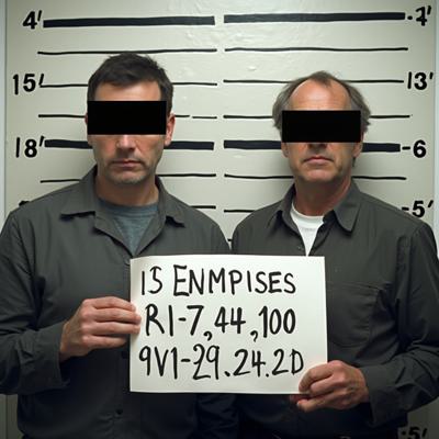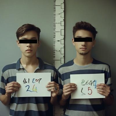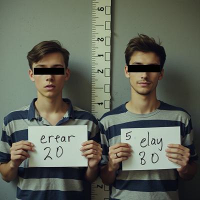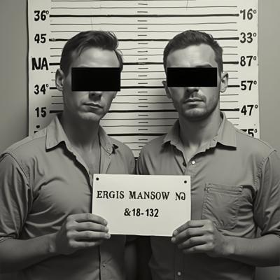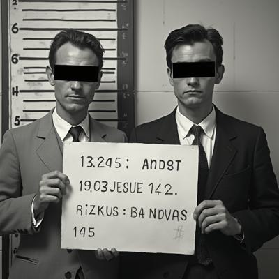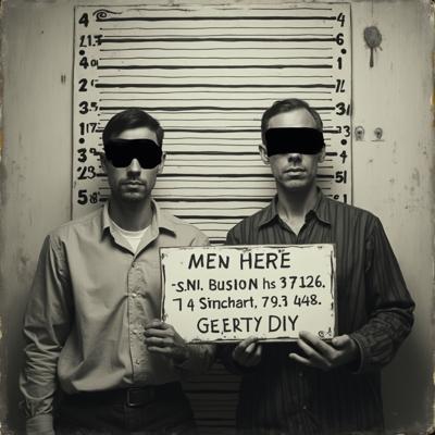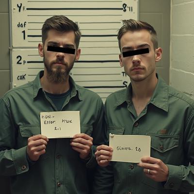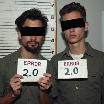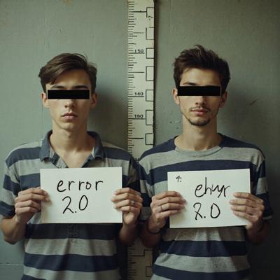 в комнате с линейкой высоты роста двое молодых мужчин один с небольшой бородкой с черными прямоугольниками на глазах. в руках у каждого табличка с данными арестантов с надписью ERROR 2.0