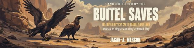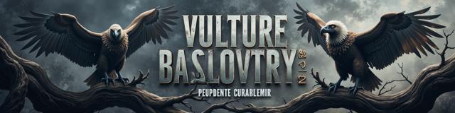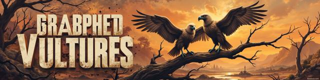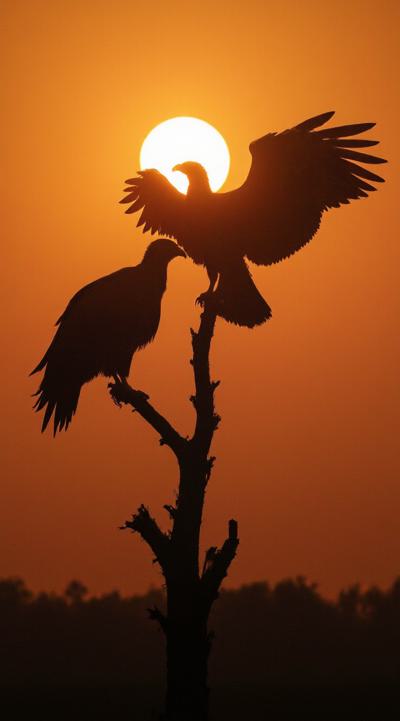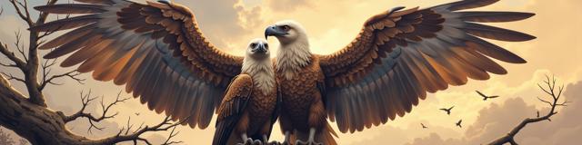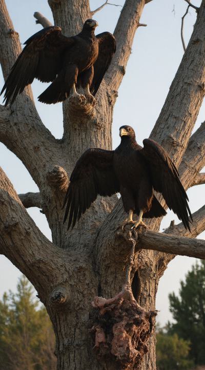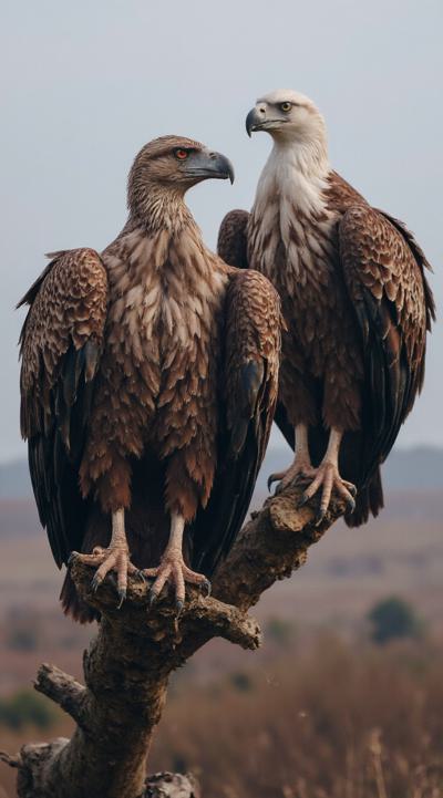 Две крупные птицы Грифы с приподнятыми крыльями. немного открытый клюв. Сидят на ветке. ждут свою умирающею жертву