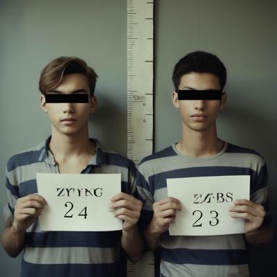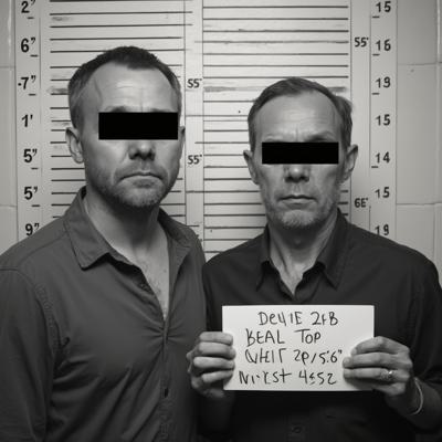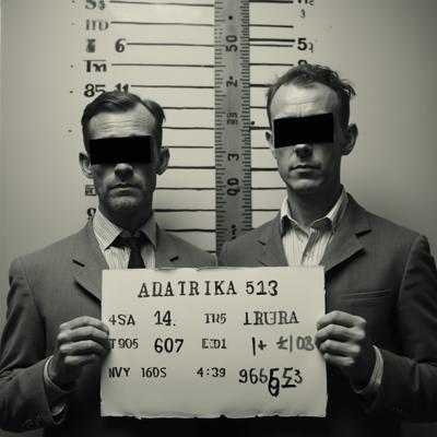 в комнате с линейкой высоты роста двое мужчин с черными прямоугольниками на глазах. в руках табличка с данными арестантов