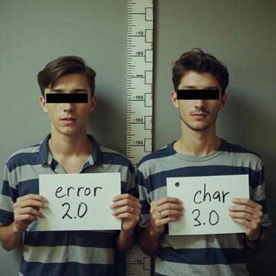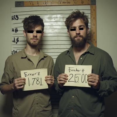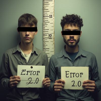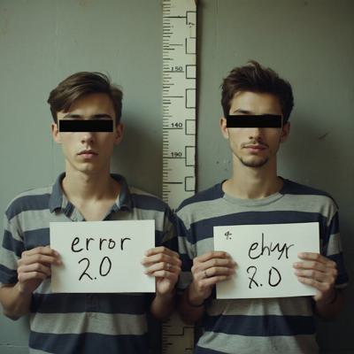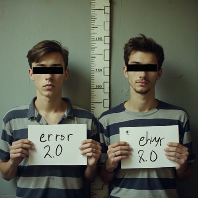 в комнате с линейкой высоты роста двое молодых мужчин один с небольшой бородкой с черными прямоугольниками на глазах. в руках у каждого табличка с данными арестантов с надписью ERROR 2.0 [Вариации для #5915762 ]