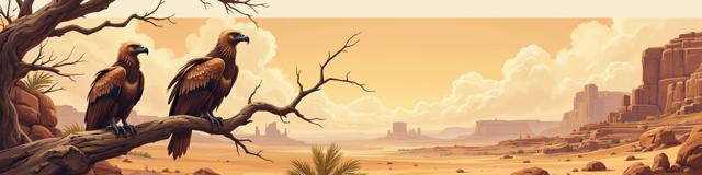 Две птицы Грифы с приподнятыми крыльями. сидят на ветке. ждут свою умирающею жертву
