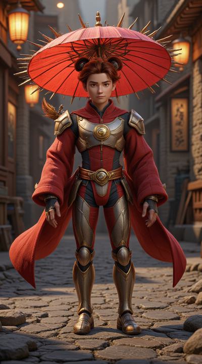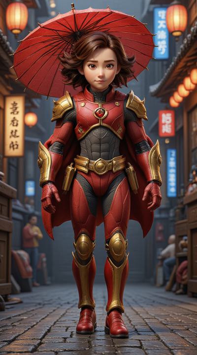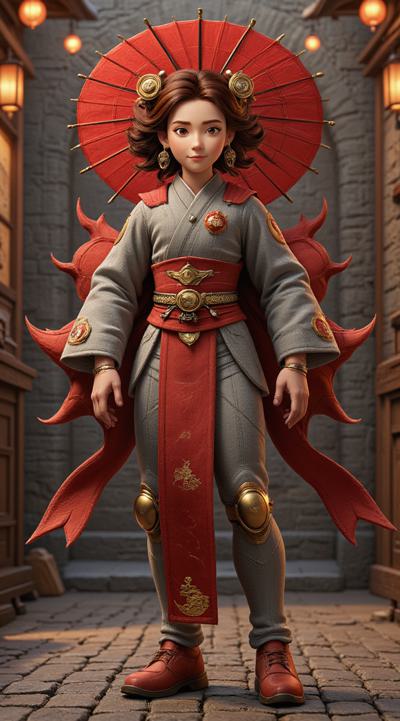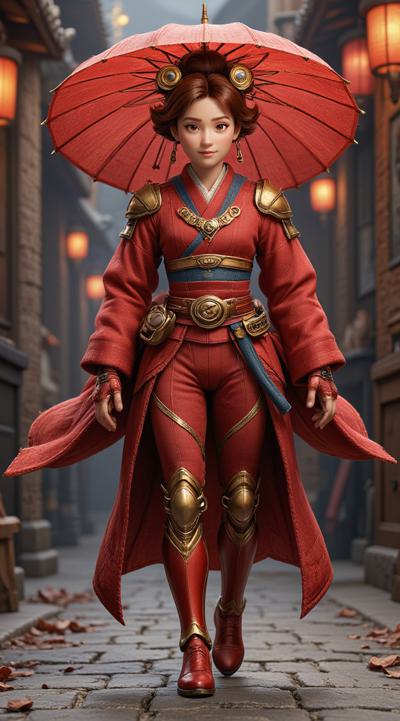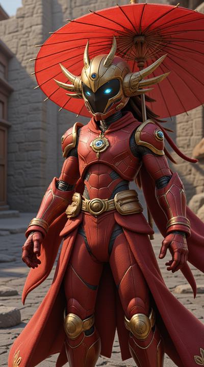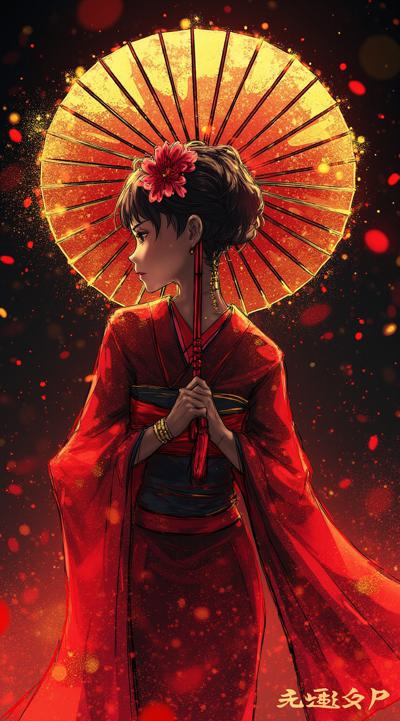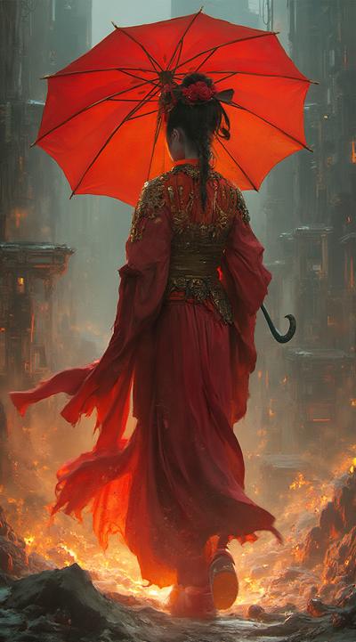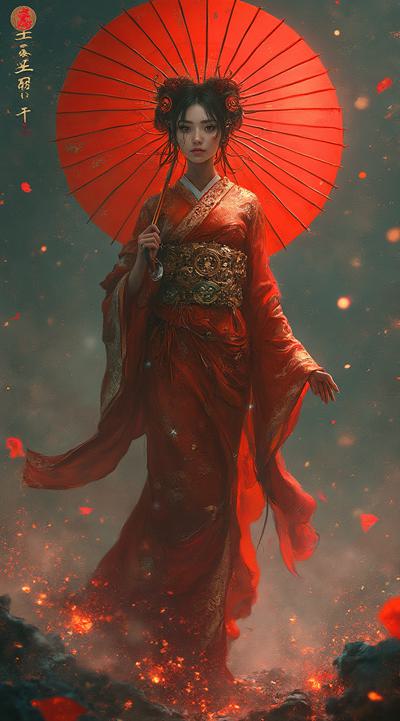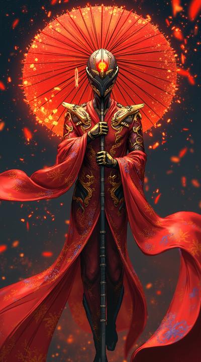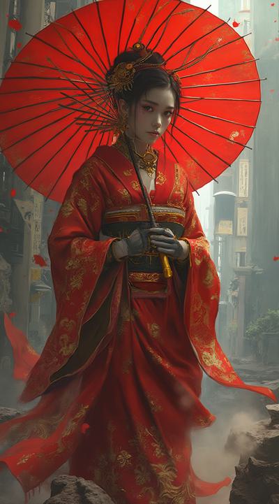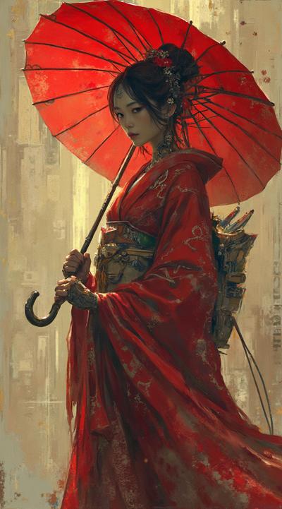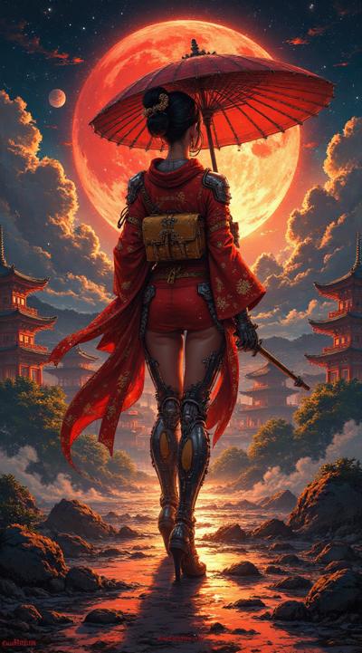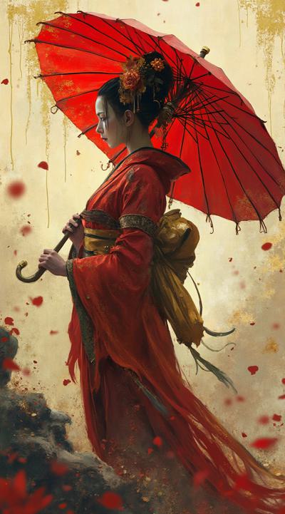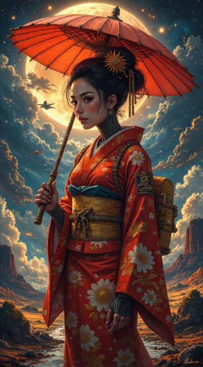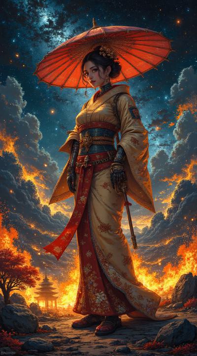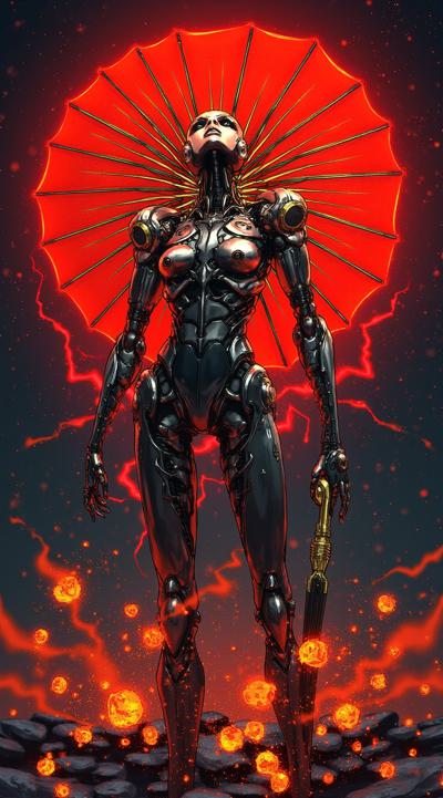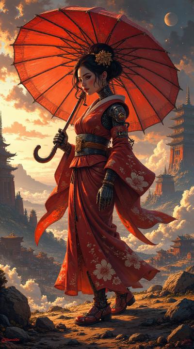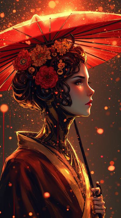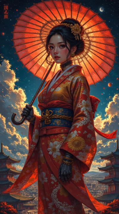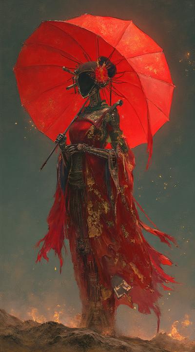 , drawing dark anime, annihilation, diarama diagrams, gold and red, space, Mechanical Geisha Cyborg with an Umbrella, ,