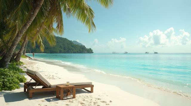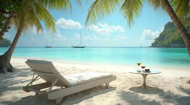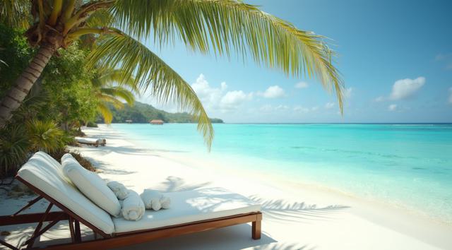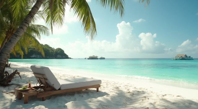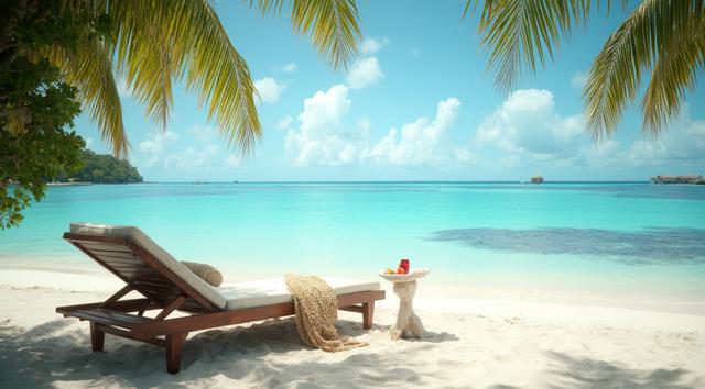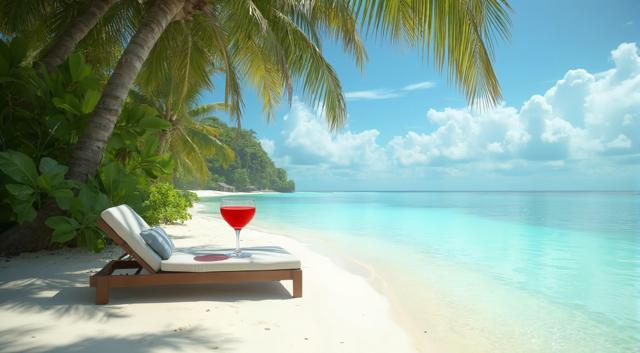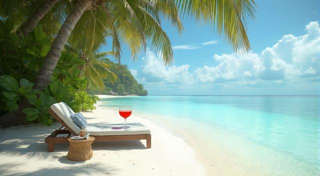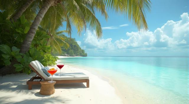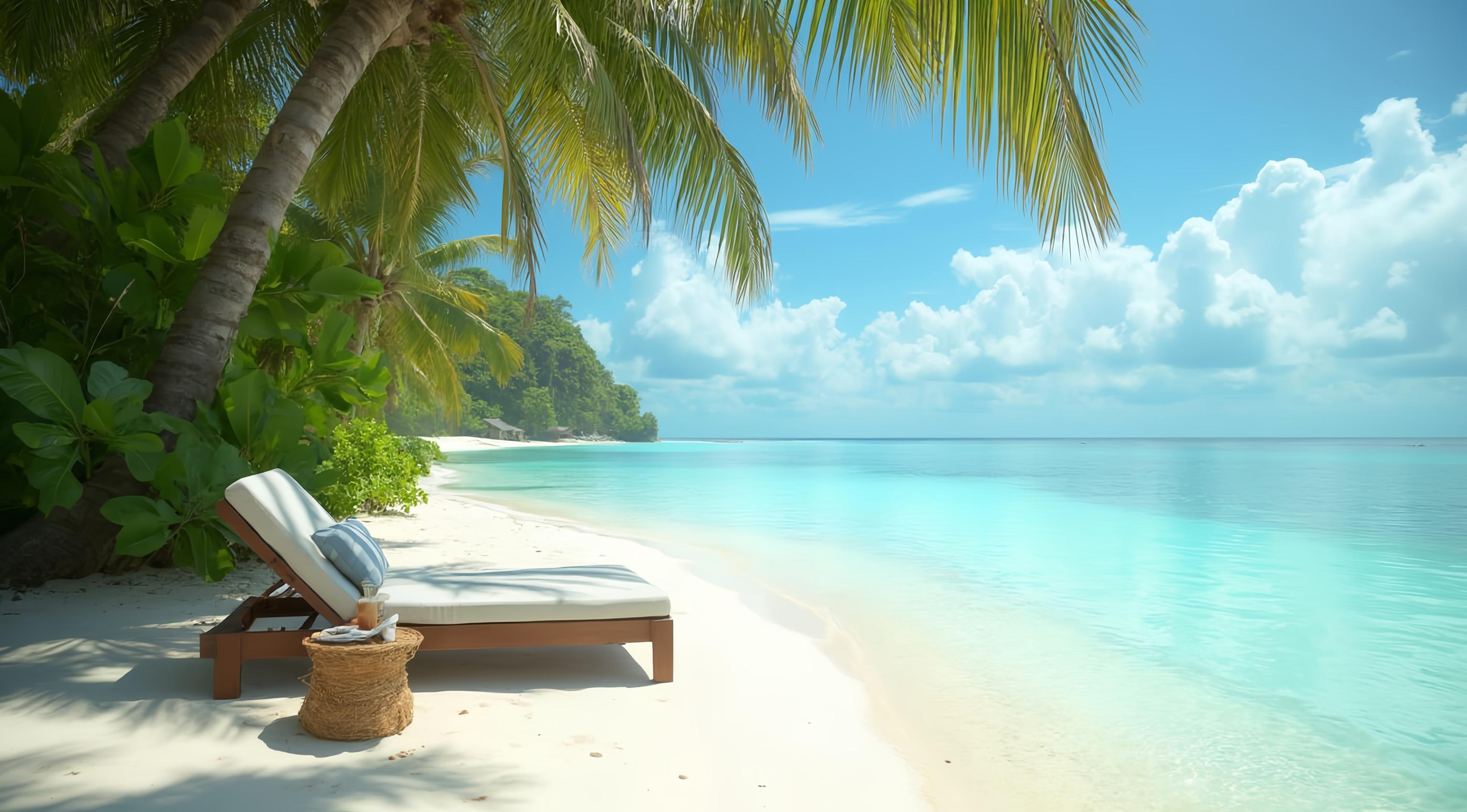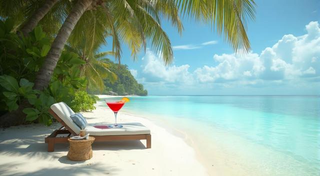 Пляж на Мальдивах, шезлонг и рядом столик с коктейлем. Все в кадре. Максимальный реализм и кинематографичность.