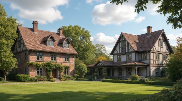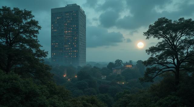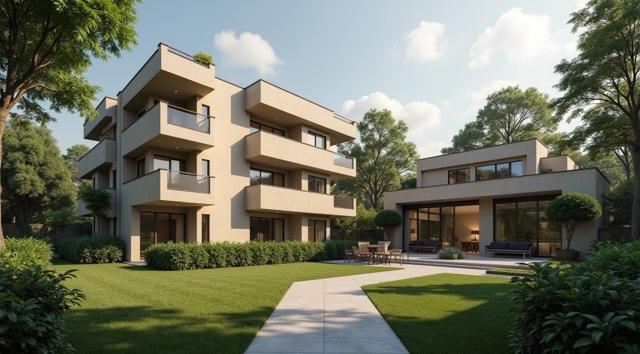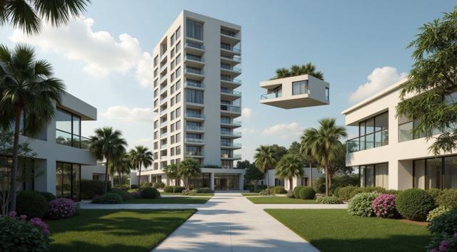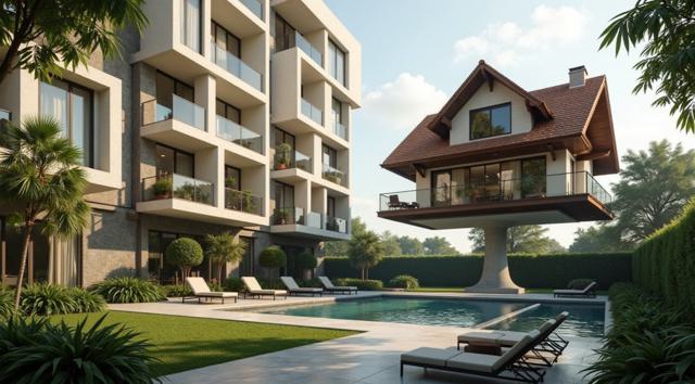 Многоквартирный дом, вокруг ухоженный двор. Напротив, справа, копия дома и ухоженного дома, но в цифровом, компьютерном виде. Как цифровая копия дома слева. Реализм с фантазией, кинематографичность.