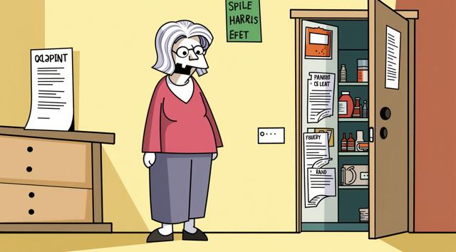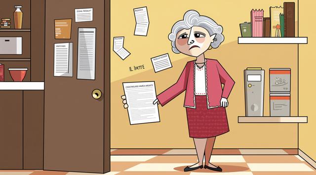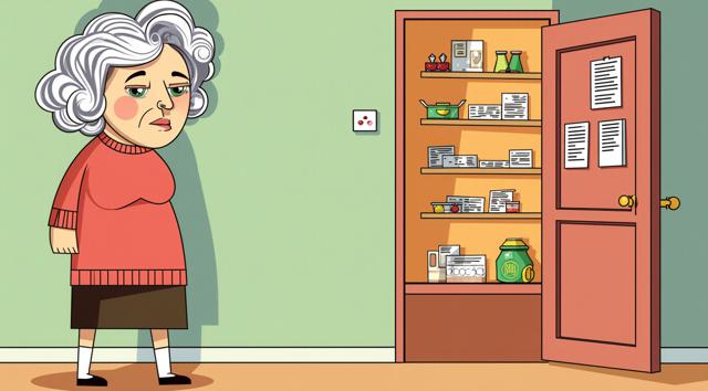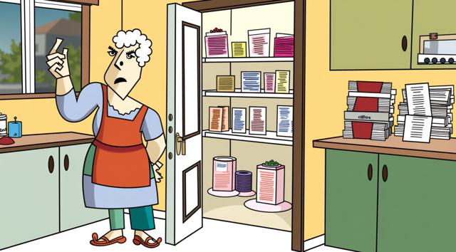 Бабушка стоит в комнате, у открытой двери в кладовую, набитую квитациями. Мультяшный стиль. Стиль бульварных комиксов. Мемы.