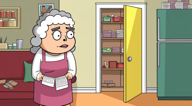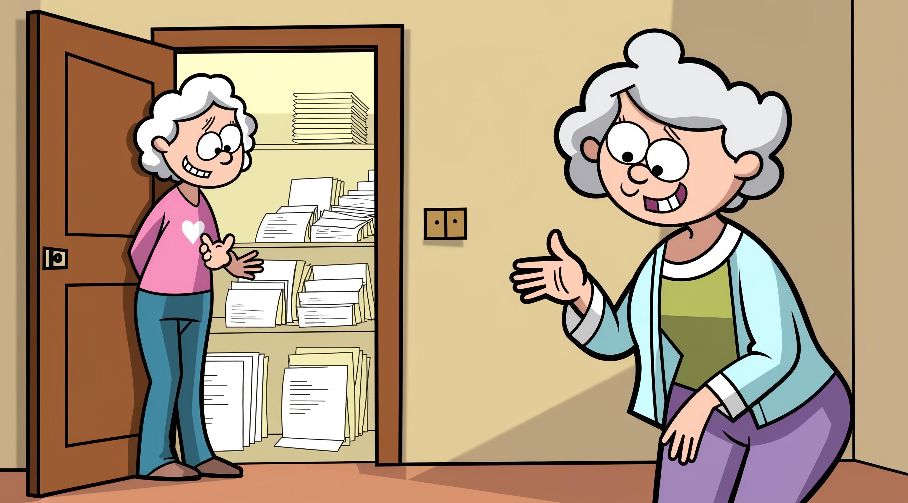 Бабушка стоит в комнате, у открытой двери в кладовую, набитую квитациями. Мультяшный стиль. Стиль бульварных комиксов. Мемы. [Качество x3 ]