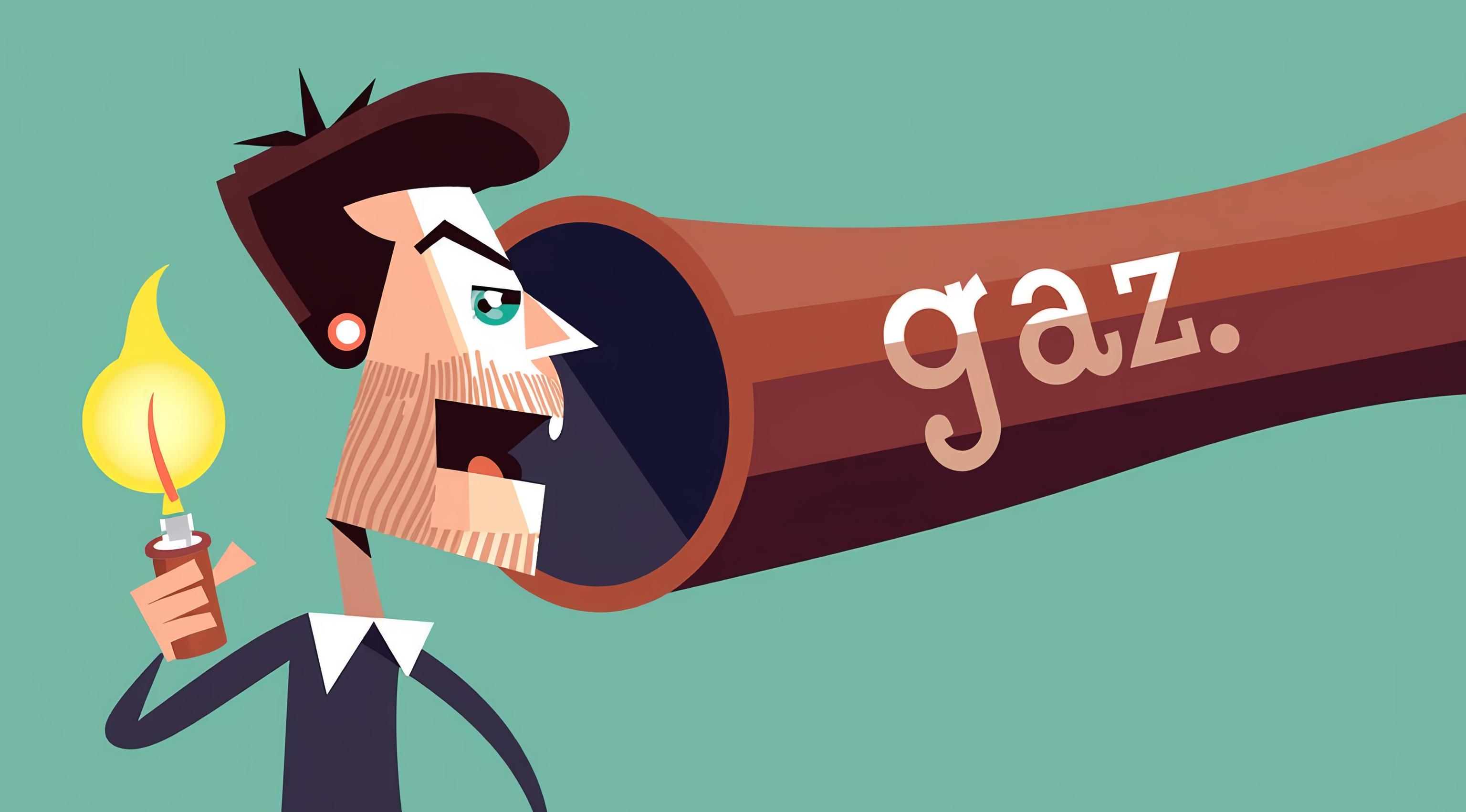 Мужик стоит с зажигалкой и пытается всмотреться в огромную трубу, на которой написано GAZ . Мультяшный стиль. Стиль бульварных комиксов. Мемы. [Качество x3 ]