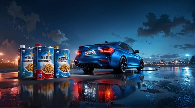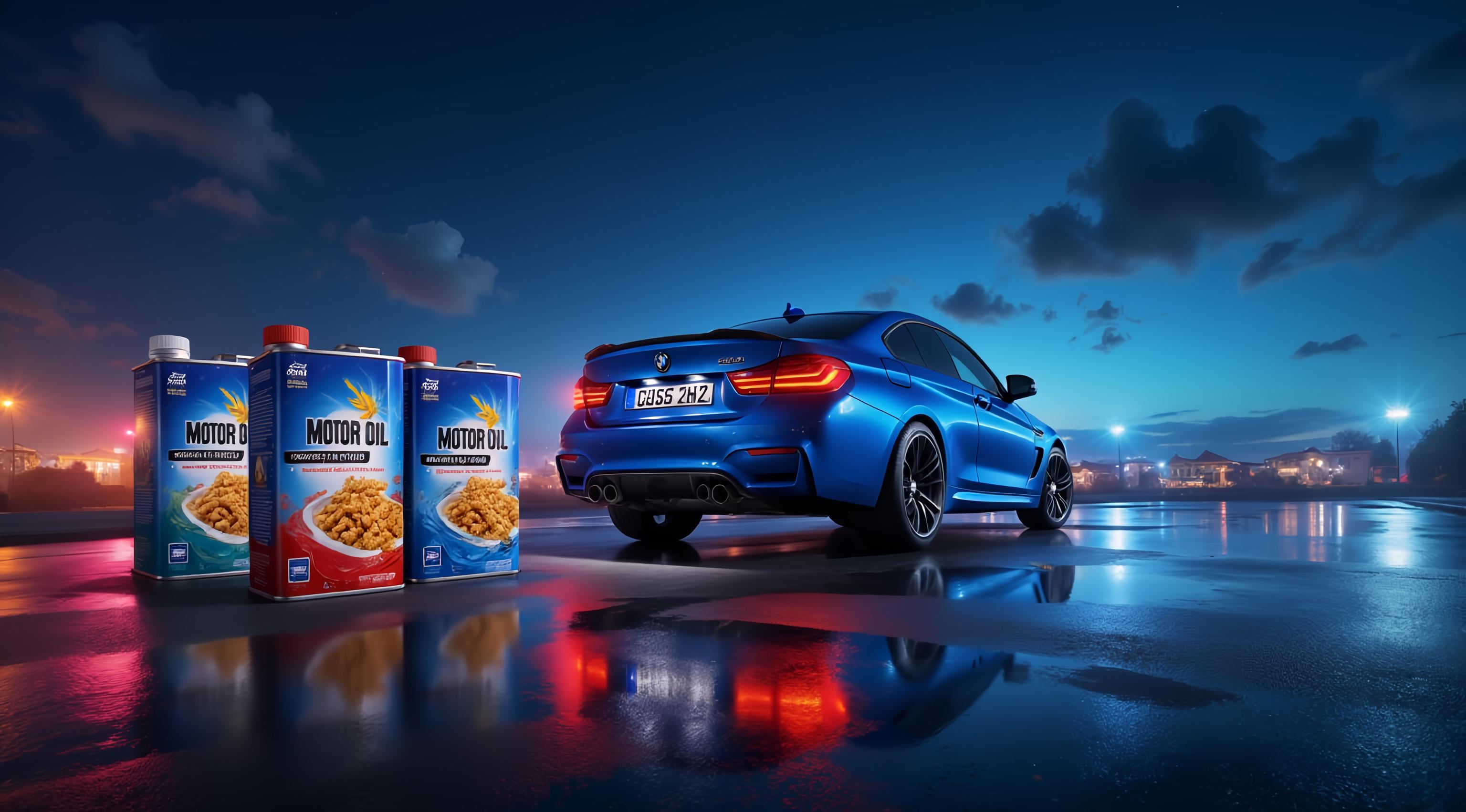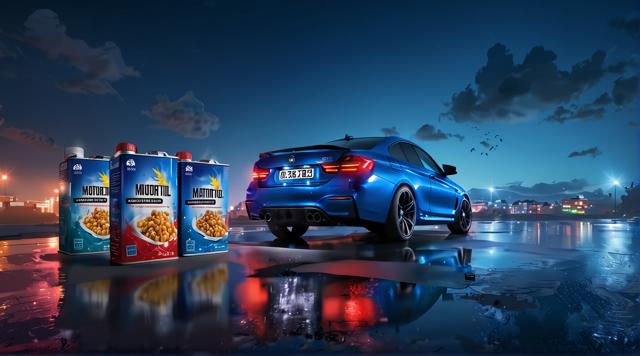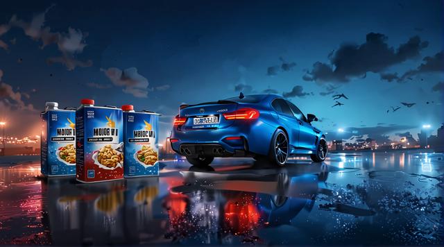добавить еще одну упаковку, на номере машины написать MAFIX, убрать значок bmw [Уточнение с детализацией для #5976305 'жестяные квадратные банки упаковки с моторным маслом семь штук, стоят впереди на чистом асфальте, сзади синяя яркая машина bmw , неоновая синяя подсветка [Качество x3 ]]'