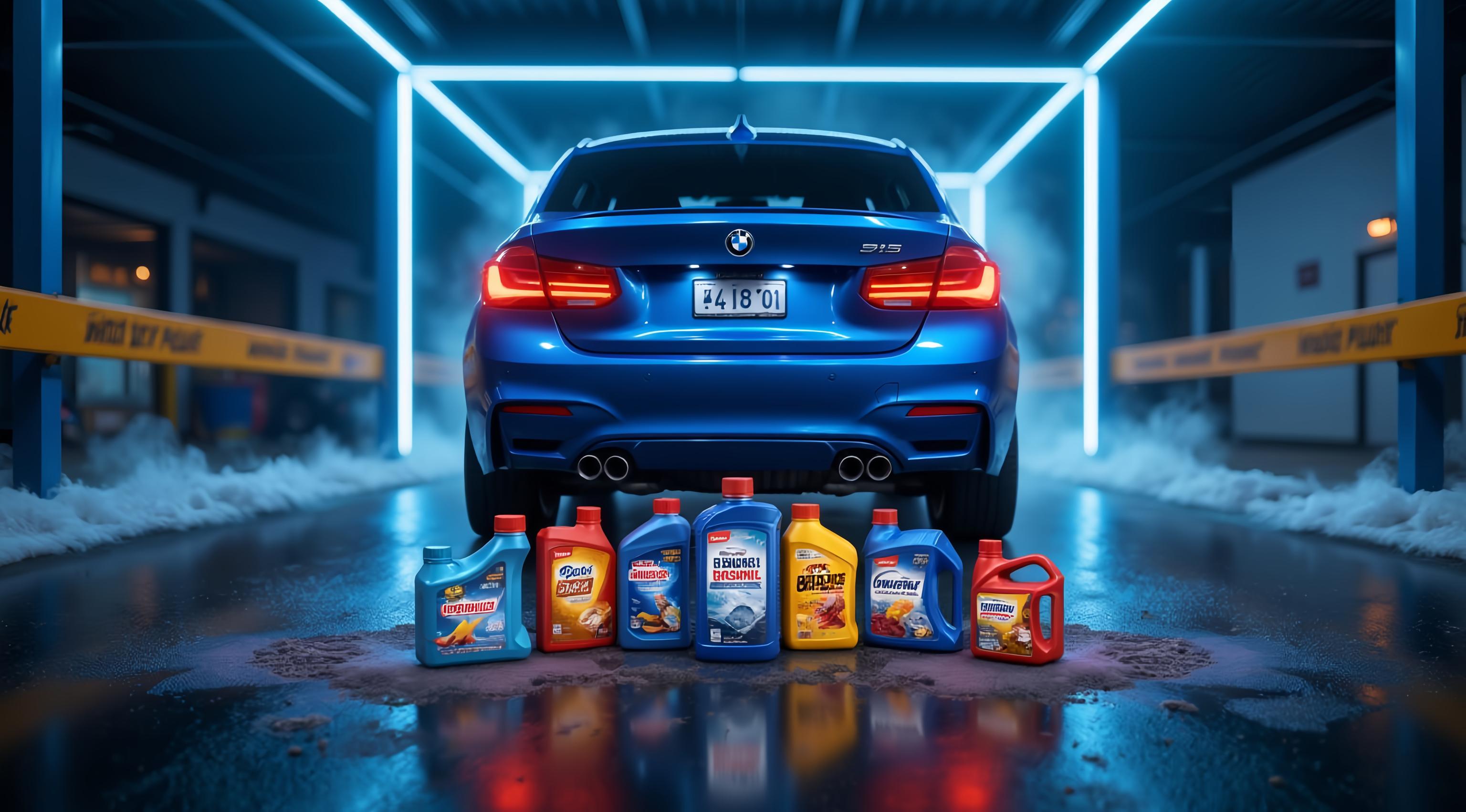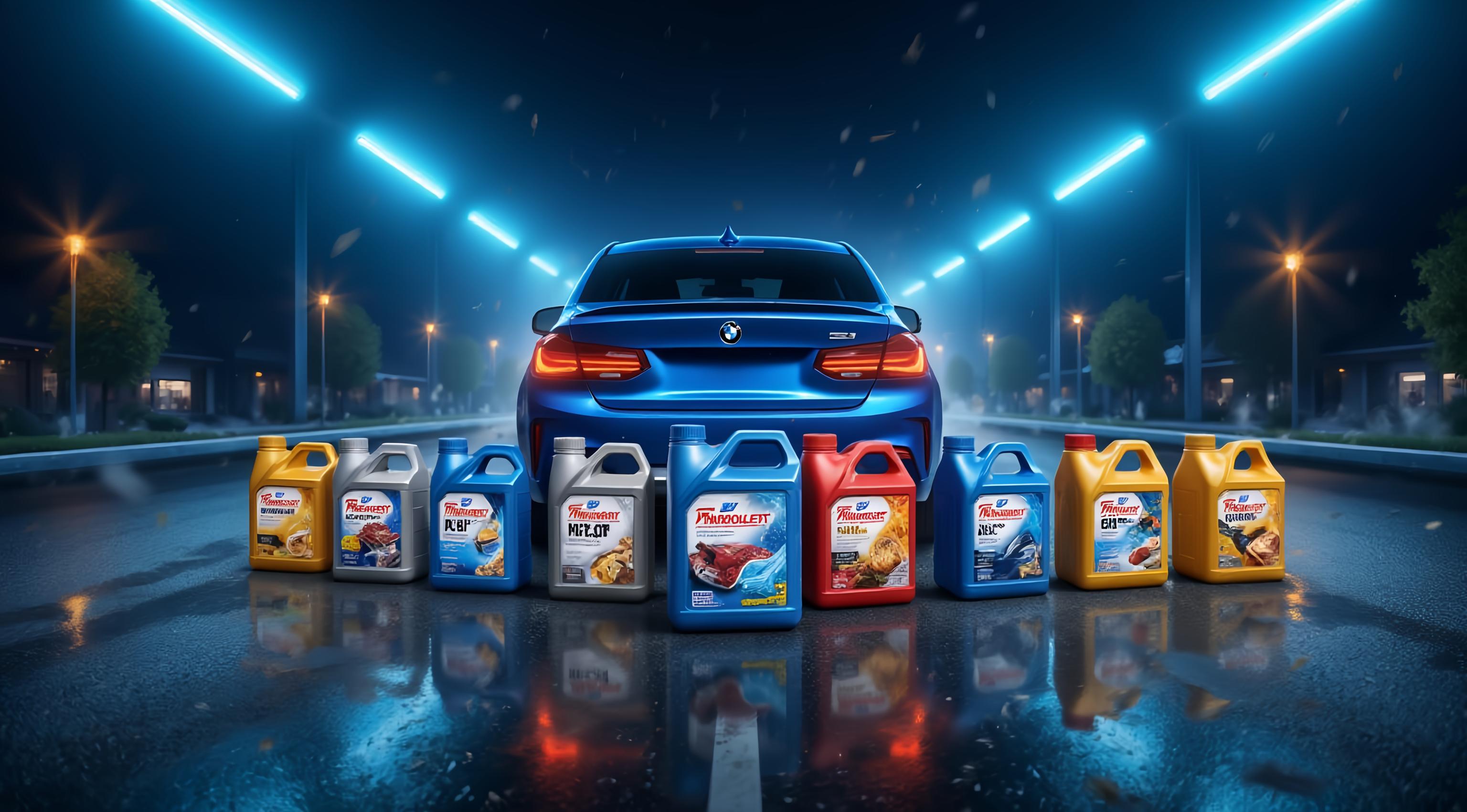 жестяные квадратные банки упаковки с моторным маслом семь штук, стоят впереди на чистом асфальте, сзади синяя яркая машина bmw , неоновая синяя подсветка [Качество x3 ]