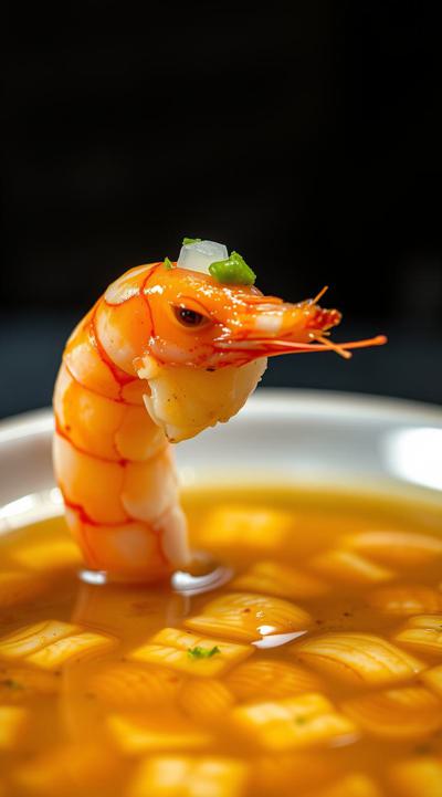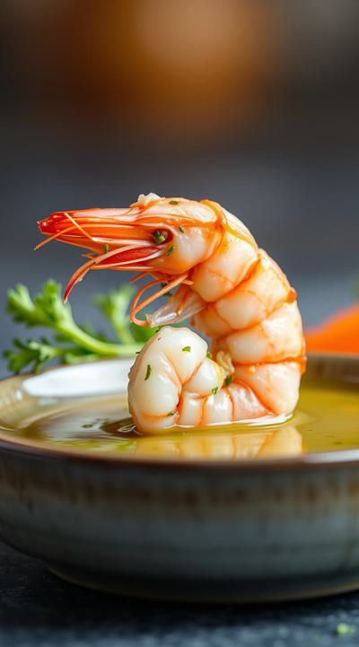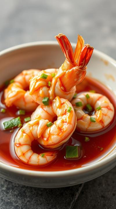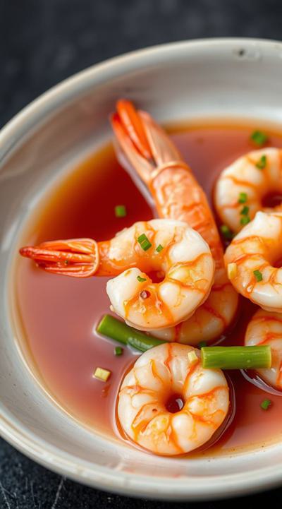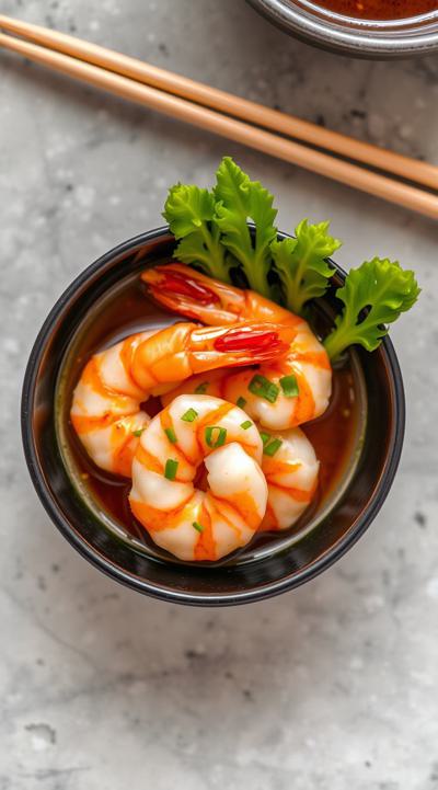 креветки лежат на черной тарелке, политые сверху соусом васаби