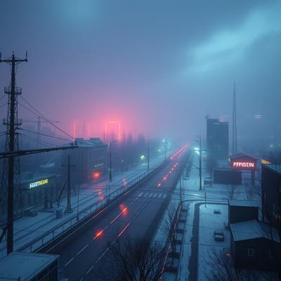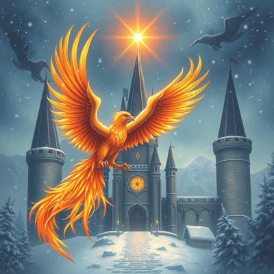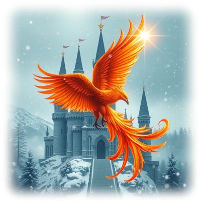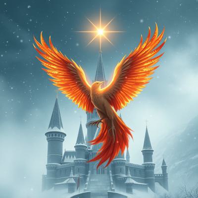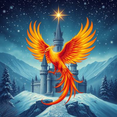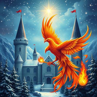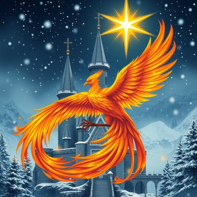 Феникс на фоне замка с тремя башнями, снегопад, священное пламя, сияющая звезда