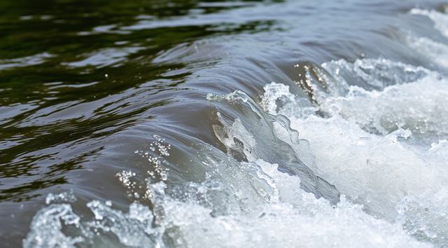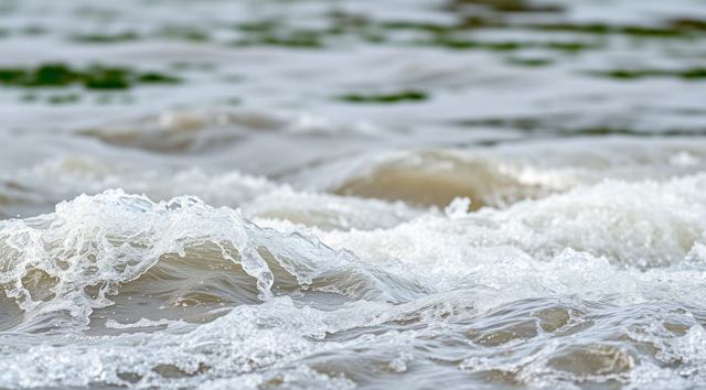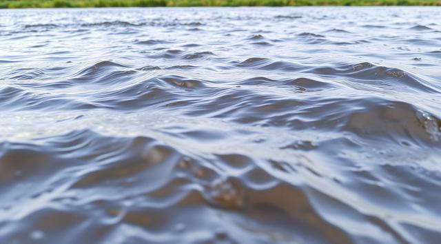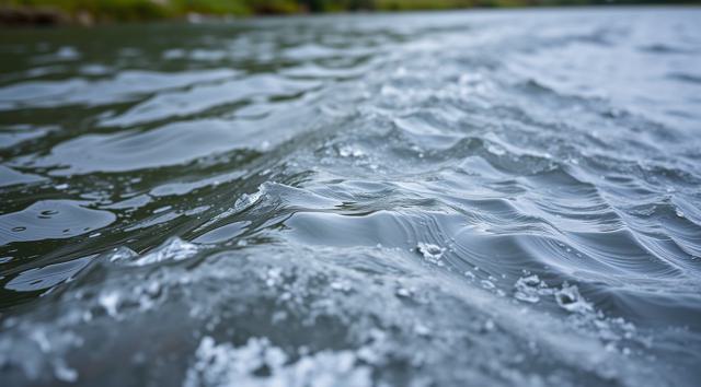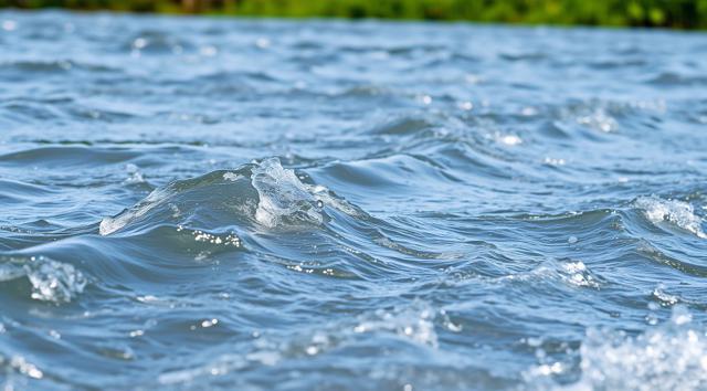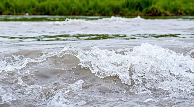 крупным планом волны реки, вдалеке зеленая трава виднеется. реалистичное фото
