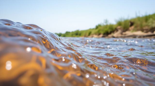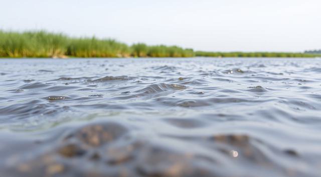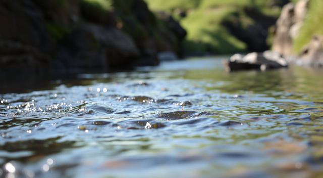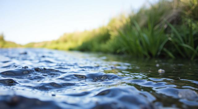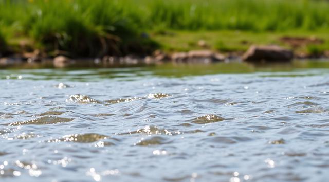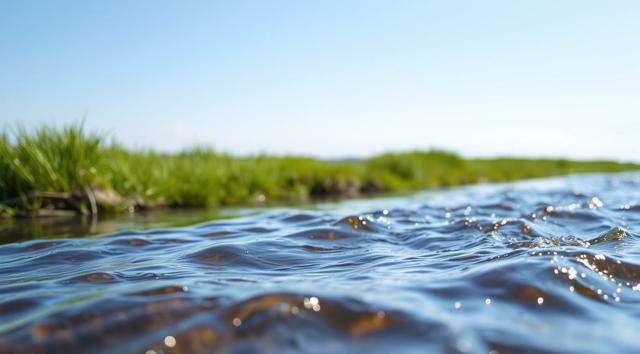 крупным планом река, вдалеке виднеется зеленая трава. реалистичное фото